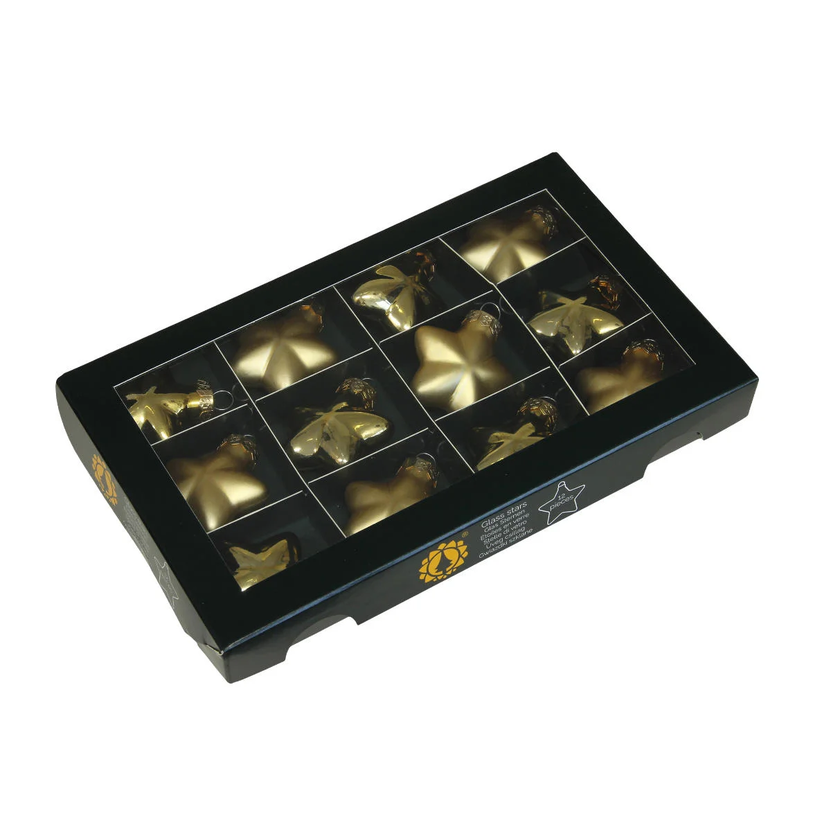 Bombki szklane, małe gwiazdki w zestawie 12 sztuk. Wykonane z wysokiej jakości szkła. W zestawie znajdują się gwiazdki w jasnym odcieniu złota, w błyszczącej i w matowej wersji. Gwiazdki to klasyczne dekoracje, które można zastosować jako ozdoba choinki ale również do dekoracji girland czy dekoracji w wazonie. Gwiazdki posiadają uchwyty służące do zawieszania i zapakowane są w dopasowany do rozmiaru kartonik ułatwiający przechowywanie.