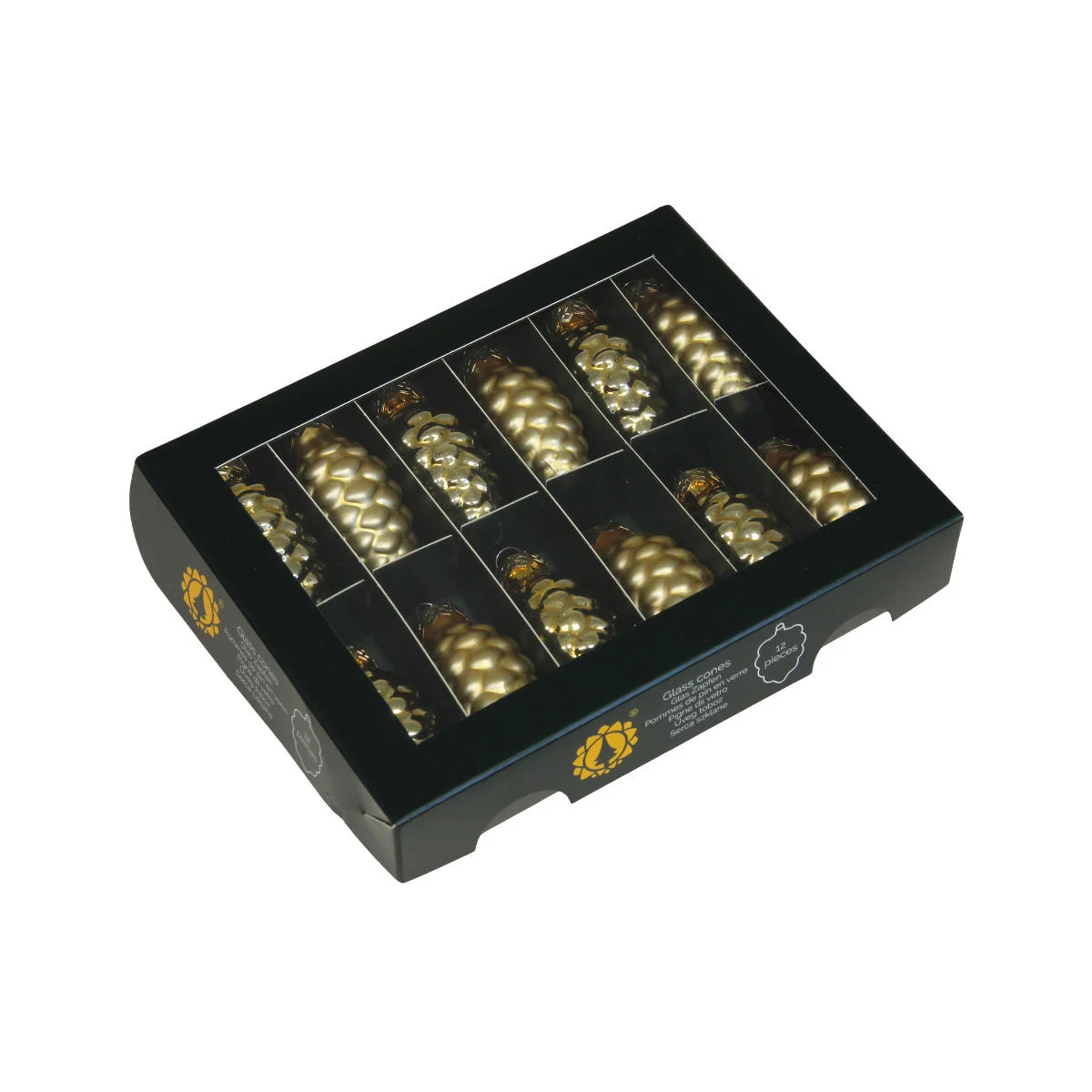 Bombki szklane w kształcie szyszek, w zestawach po 12 sztuk. Produkt o wysokiej jakości, bardzo starannie wykonany. W zestawie znajdują się szyszki w kolorze jasnego złota, z matowym i błyszczącym wykończeniem. Szyszki można zastosować jako ozdobę na choinkę oraz do dekoracji girland i aranżacji w wazonie. Szyszki o wysokości 60mm posiadają uchwyty służące do zawieszania i zapakowane są w pasujący do rozmiaru kartonik z celofanowym okienkiem, ułatwiający przechowywanie.