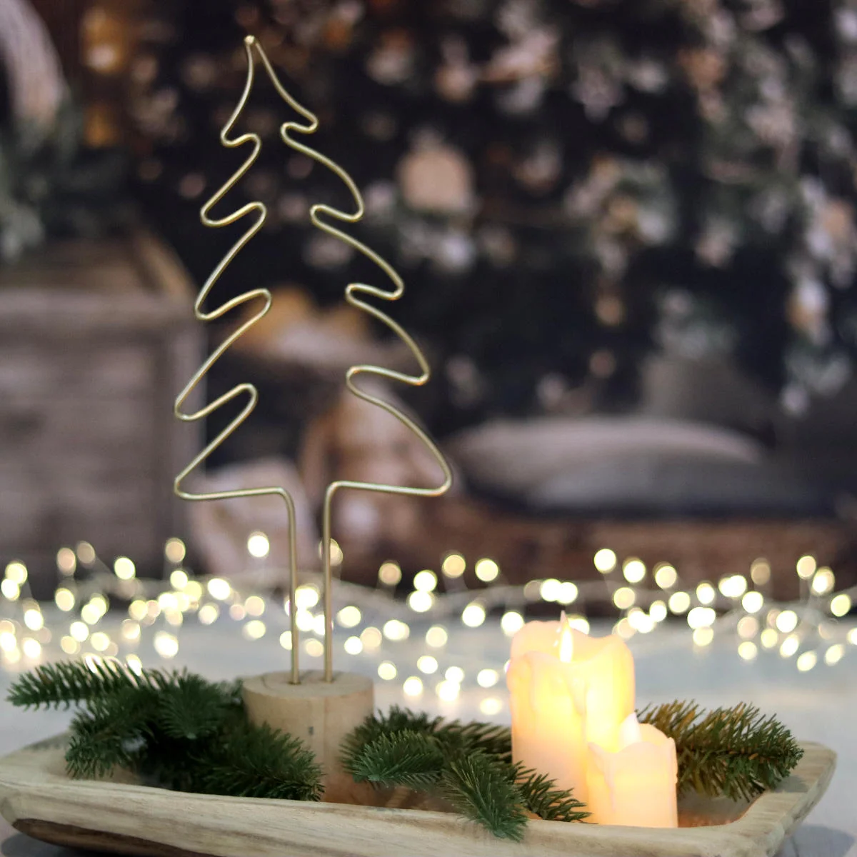 Dekoracyjna, ażurowa choinka o wysokości 34cm. Wykonana z drucika o średnicy 3mm i umieszczona na drewnianej podstawie. Idealnie sprawdzi się jako samodzielna dekoracja stołu, kominka i parapetu okna. Nadaje się również jako element wianka, stroika i każdej kompozycji świątecznej. Można ją połączyć z innymi figurkami, girlandą, bombkami oraz lampkami choinkowymi.