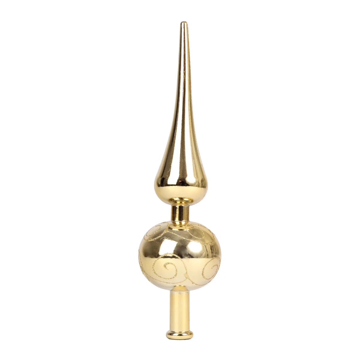 Szpic, czubek na choinkę, w klasycznym kształcie. Wykonany w całości z wysokiej jakości tworzywa sztucznego, nietłukący, z ozdobnym, brokatowym wzorem.
