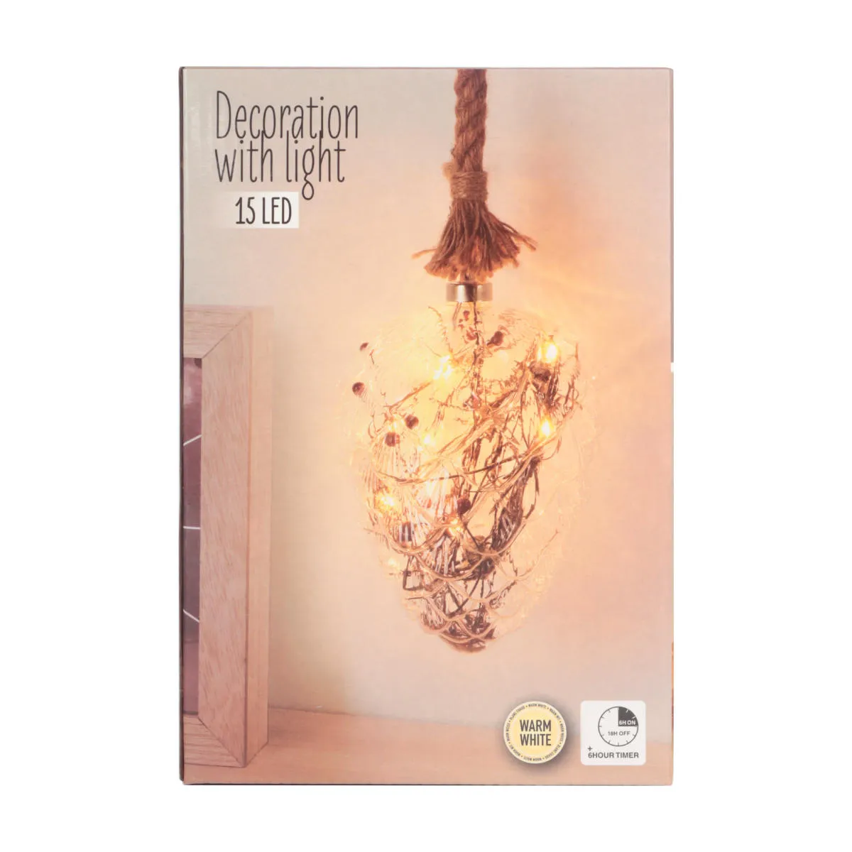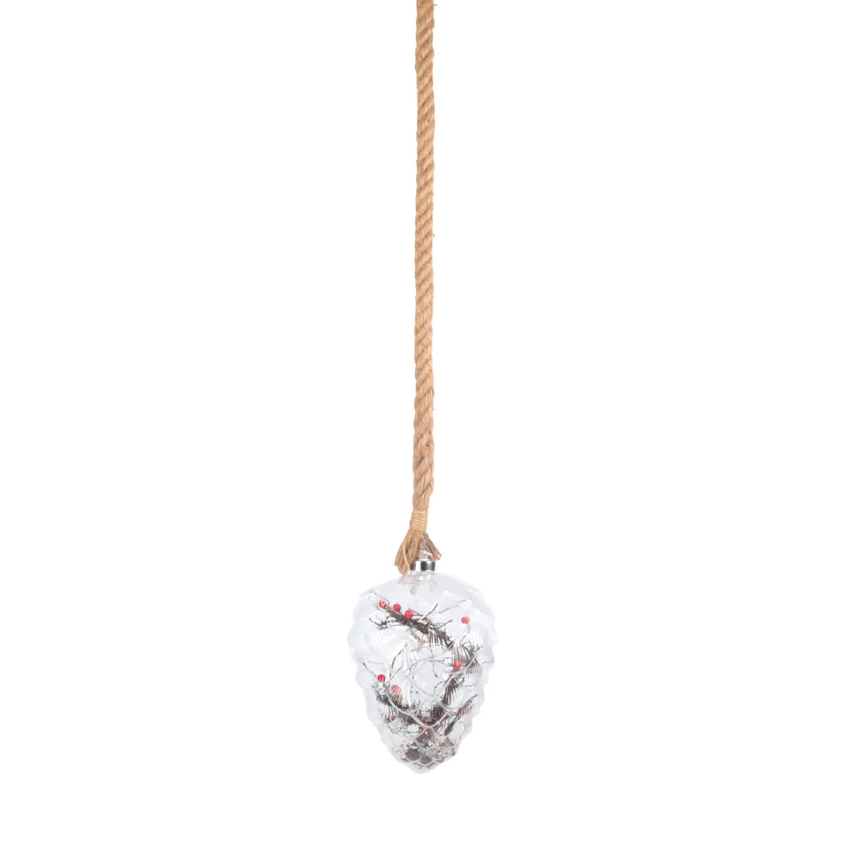 Dekoracja świąteczna, zawieszka z oświetleniem LED. Ozdoba w kształcie szyszki, wykonana z wysokiej jakości tworzywa sztucznego, przeźroczysta. Posiada w środku 15 diod LED z ciepłym, białym światłem oraz ozdobny stroik w postaci naturalnych szyszek i gałązek z imitacją owoców. Diody zasilane są trzema bateriami typu AA 1,5V (brak w zestawie). Przewód zasilania jest częściowo pokryty naturalnym, grubym sznurem. Świecąca szyszka o wymiarach 21x15cm, idealnie nadaje się jako samodzielna dekoracja okna lub element kompozycji. Świetnie sprawdzi się także jako upominek lub dodatek do prezentu. Dekoracja posiada funkcję Timer 6h/18h, która pozwala na ustawienie czasu pracy. Po włączeniu tej funkcji dioda świeci przez 6 godzin, a przez następne 18 godzin pozostaje wyłączona. Oświetlenie przeznaczone jest do użytku wewnątrz pomieszczeń.