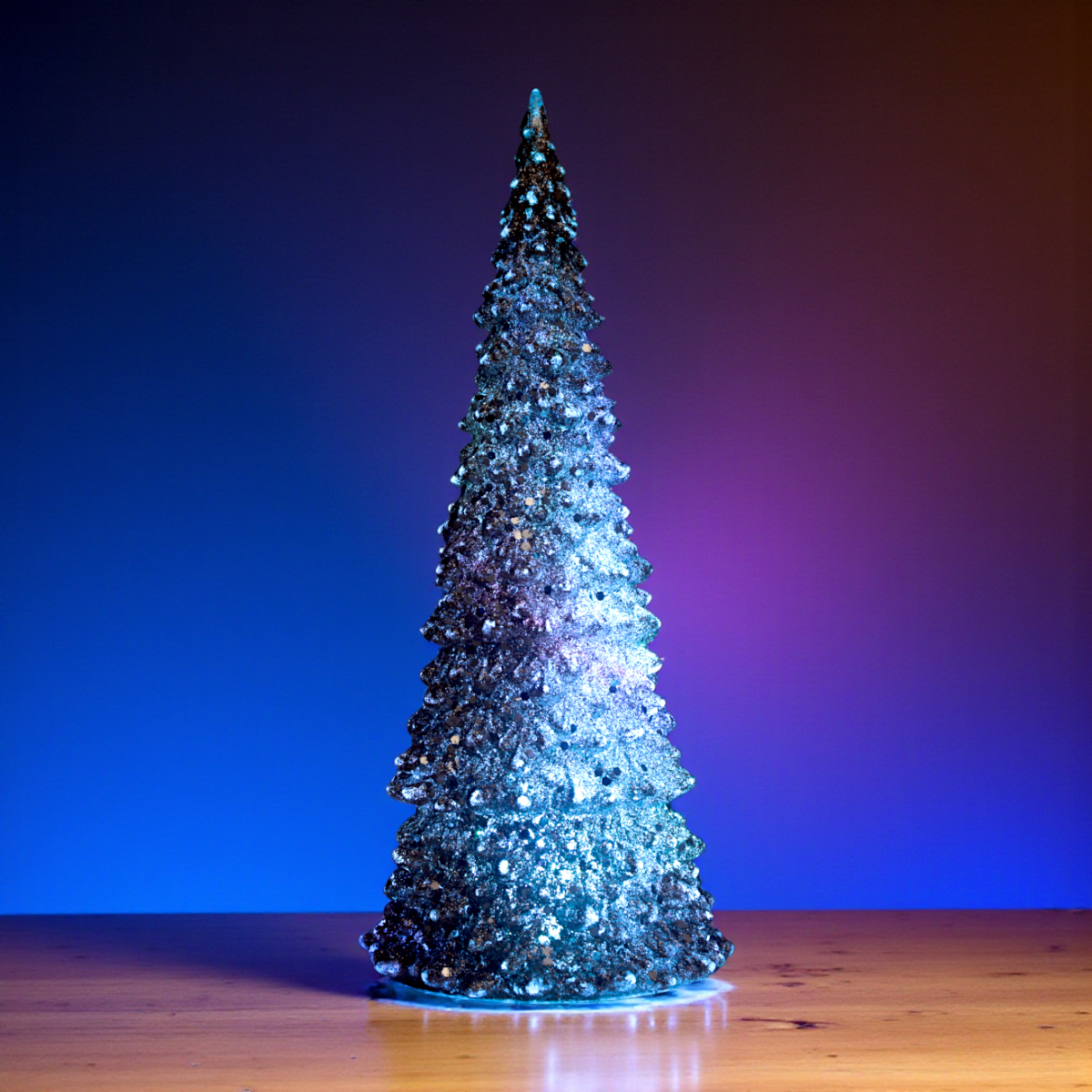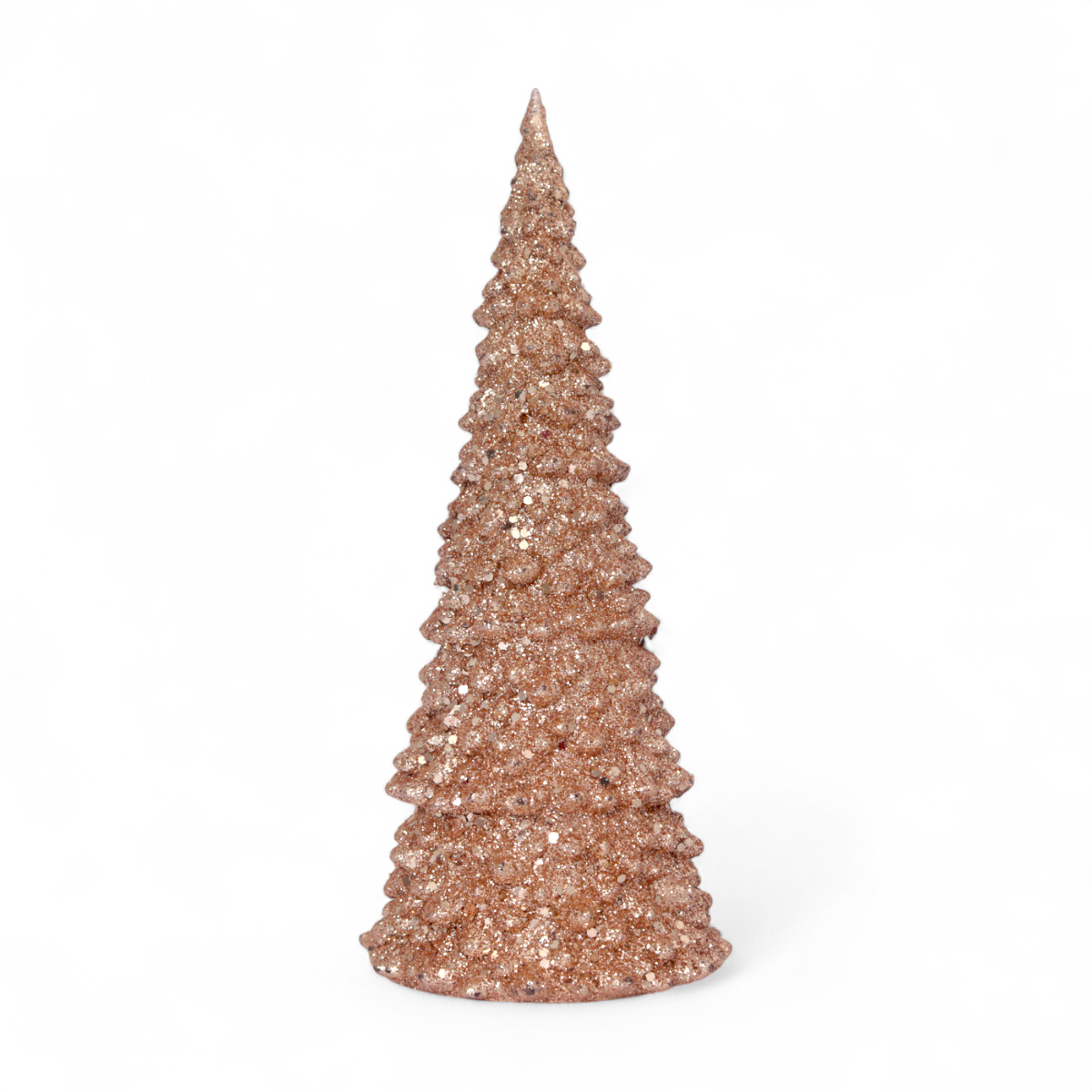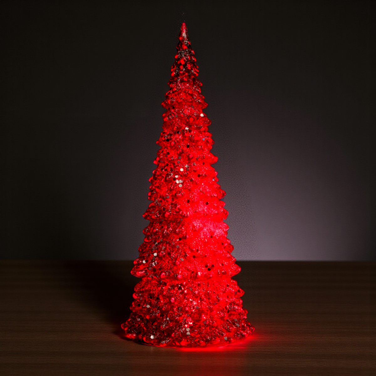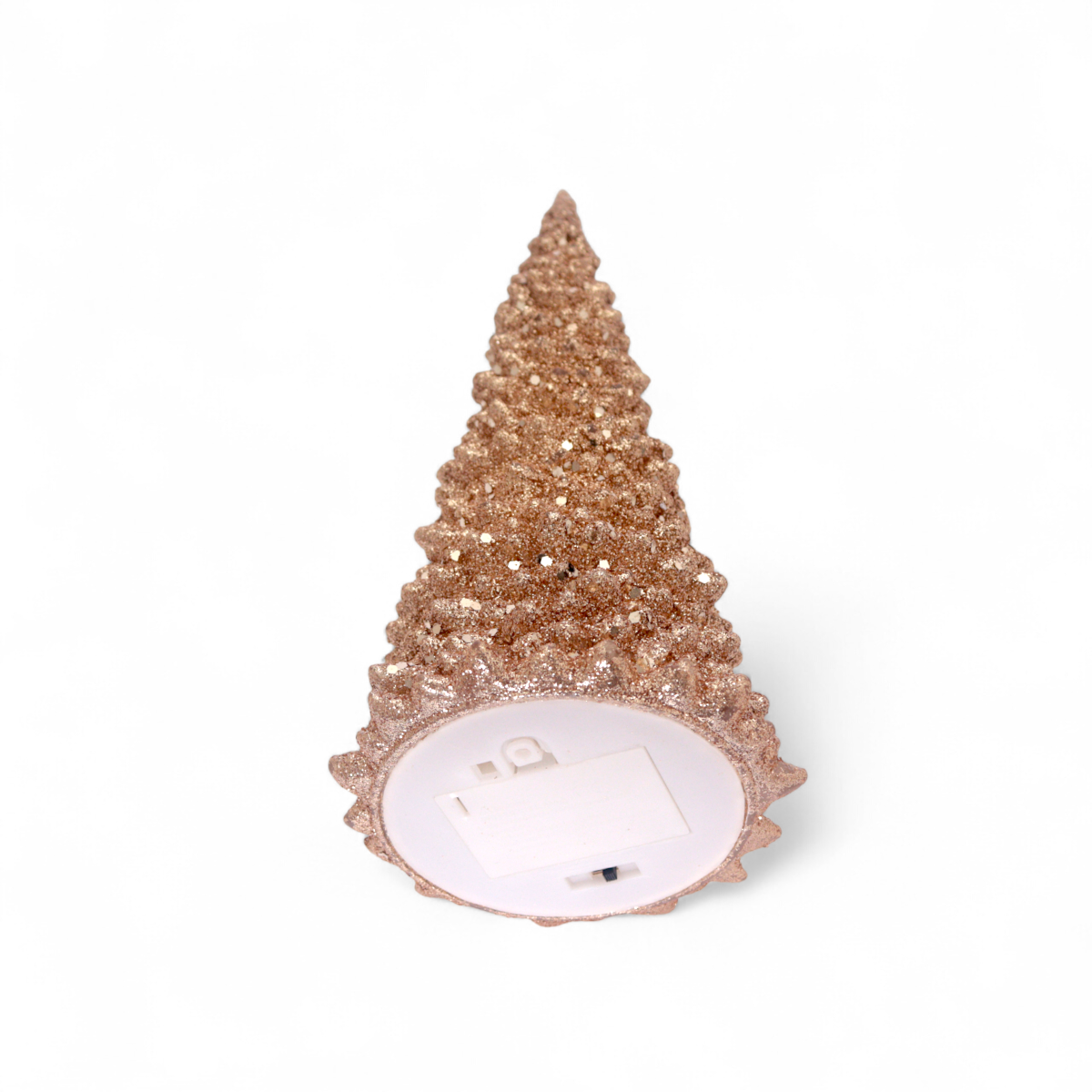 Świecąca dekoracja świąteczna. Choinka o wysokości 27cm, z oświetleniem LED. Wykonana z tworzywa sztucznego i ozdobiona dużą ilością złotego brokatu oraz drobnymi cekinami. Wyposażona jest w diodę LED płynnie zmieniającą kolor. Idealnie nadaje się na samodzielną dekorację parapetu okna lub komody. Doskonale sprawdzi się również jako drobny upominek lub dodatek do prezentu. Zasilana jest trzema bateriami typu AAA (brak w zestawie). Produkt przeznaczony do użytku wewnątrz pomieszczeń.