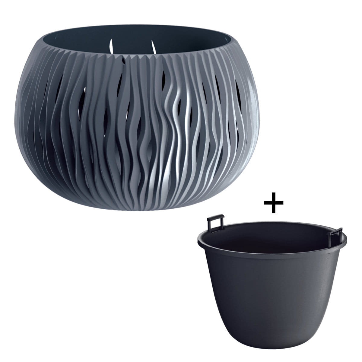 Okrągła, bardzo nowoczesna doniczka plastikowa do zawieszenia, z wyciąganym wkładem, z serii Sandy Bowl. Doniczka posiada fakturę pofalowanych, pionowych żłobień, przez które widać wkład, co dodatkowo nadaje efekt kolorystyczny. Dzięki małym uchwytom wkład łatwo się wyciąga, co daje możliwość szybkiej zmiany np. koloru osłonki. Wykonana z wysokiej jakości tworzywa sztucznego. Bardzo wytrzymała i odporna na działanie promieni słonecznych. Produkt do użytku wewnątrz i na zewnątrz pomieszczeń, łatwy w czyszczeniu. W kontakcie z wodą lub niskimi temperaturami zachowuje pierwotny kształt i kolor. W zestawie znajduje się zestaw metalowych linek z karabińczykiem służących do zawieszenia doniczki.