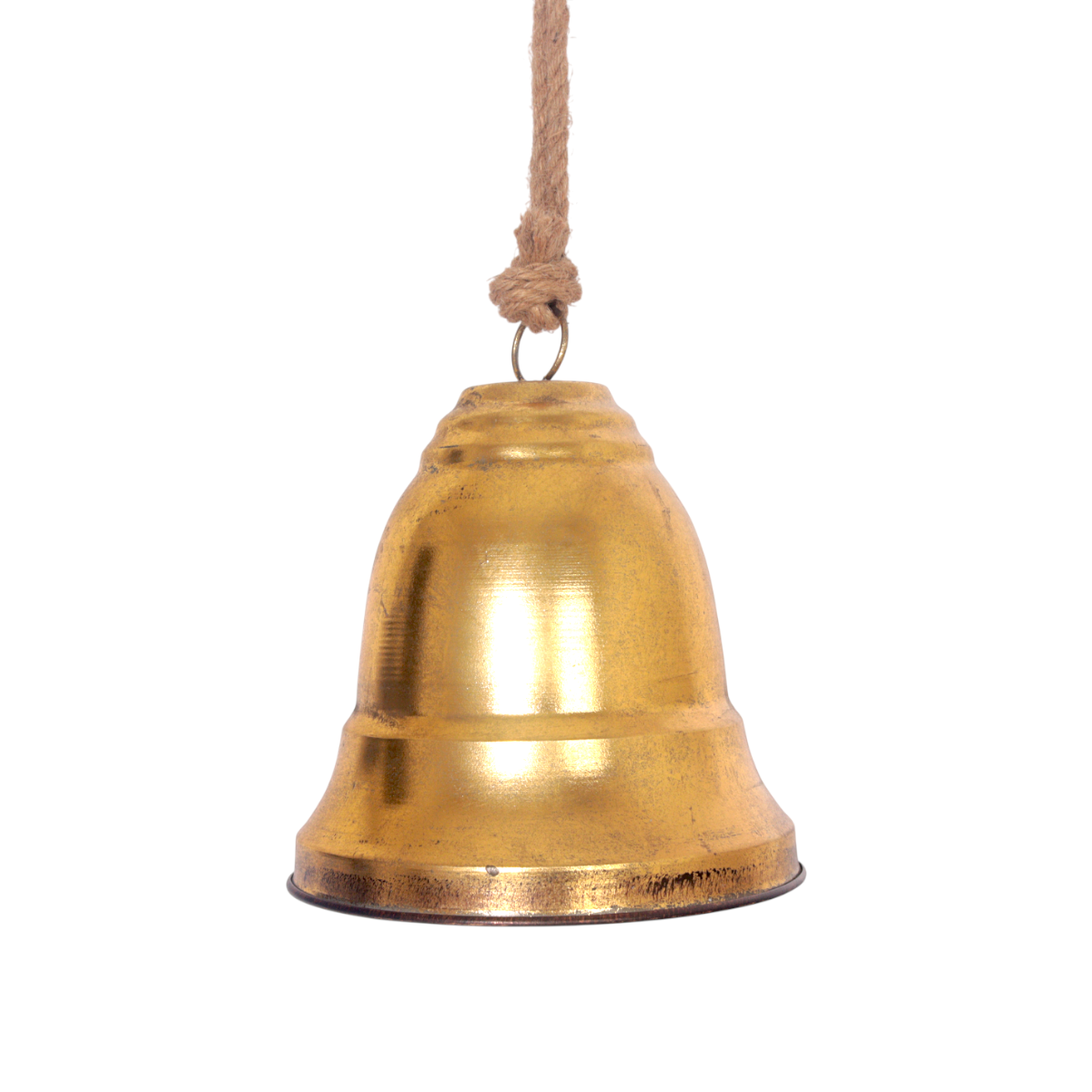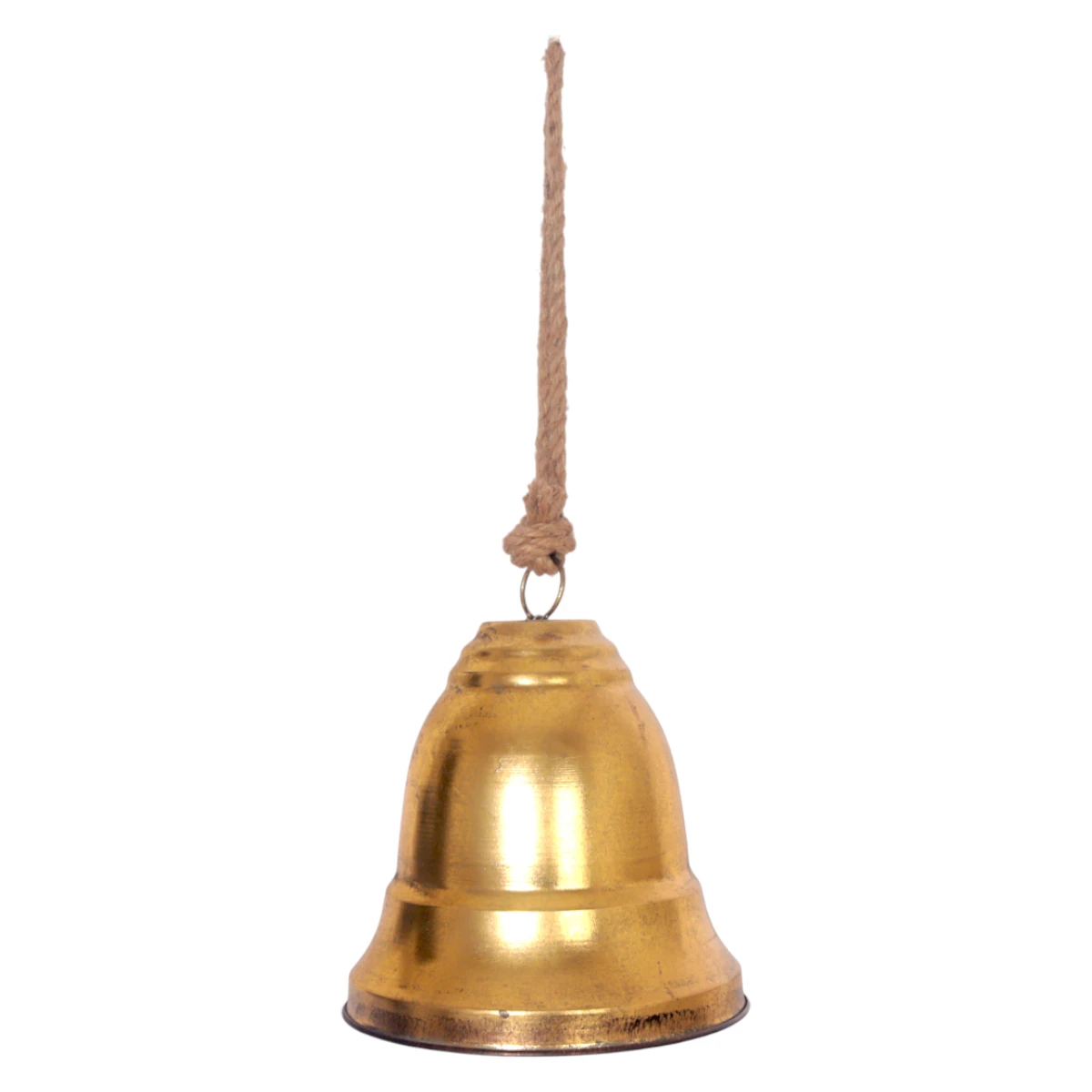 Duży, metalowy dzwon dekoracyjny z jutowym sznurem służącym do zawieszania. Stylizowany na stary, dzwon o wymiarach 23,5x28cm, wykonany został z metalu, pomalowany na kolor złoty i delikatnie przetarty. Będzie idealna dekoracją na balkonie, tarasie lub w ogrodzie. Sprawdzi się również jako ozdoba dużej kompozycji świątecznej.