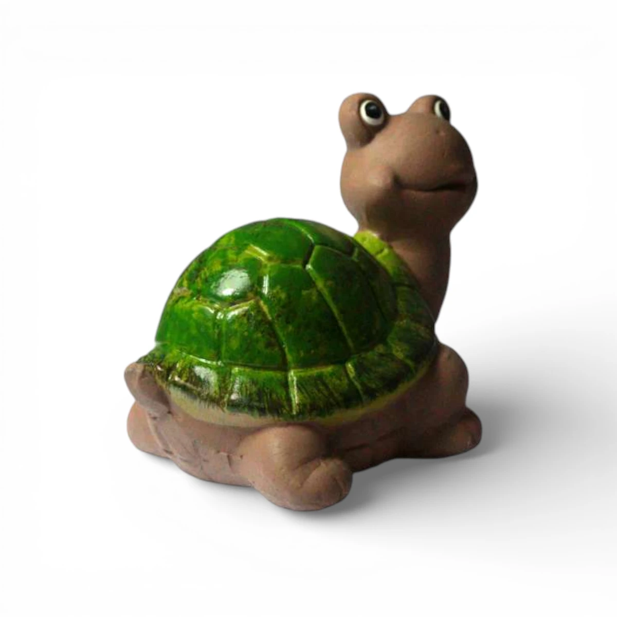Brązowo-zielony żółwik, figurka dekoracyjna o wymiarach 9x12cm. Figurka wykonana jest z ceramiki, barwiona i częściowo lakierowana. Idealnie nadaje się jako samodzielna dekoracja dowolnego miejsca na balkonie i tarasie lub jako element kompozycji. Świetnie sprawdzi się również jako dodatek do bukietu lub upominek