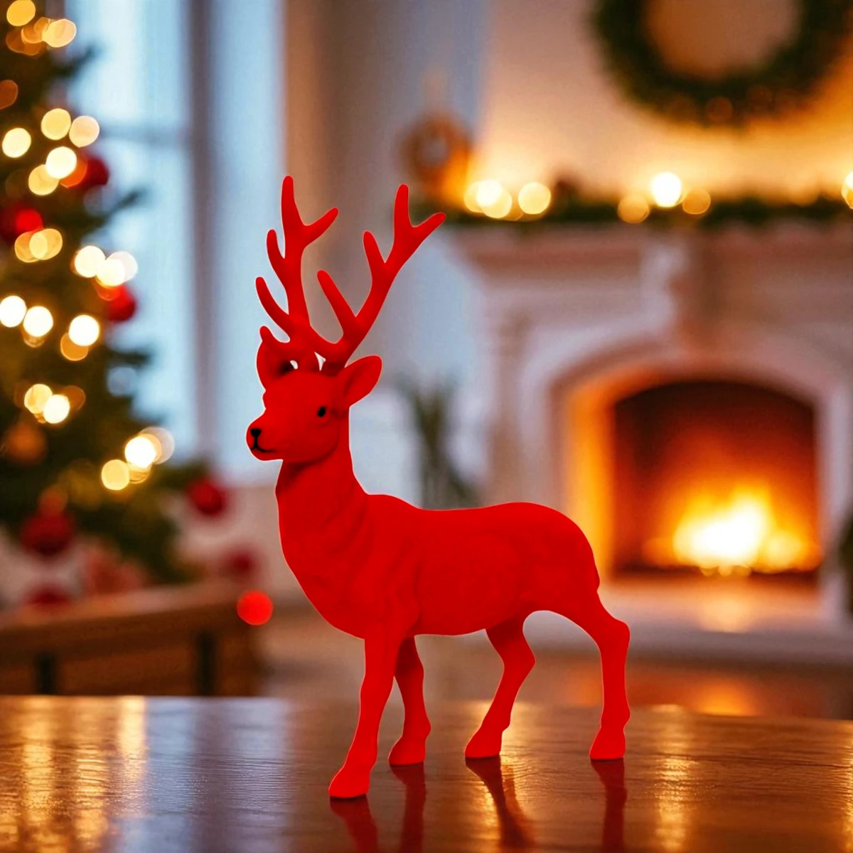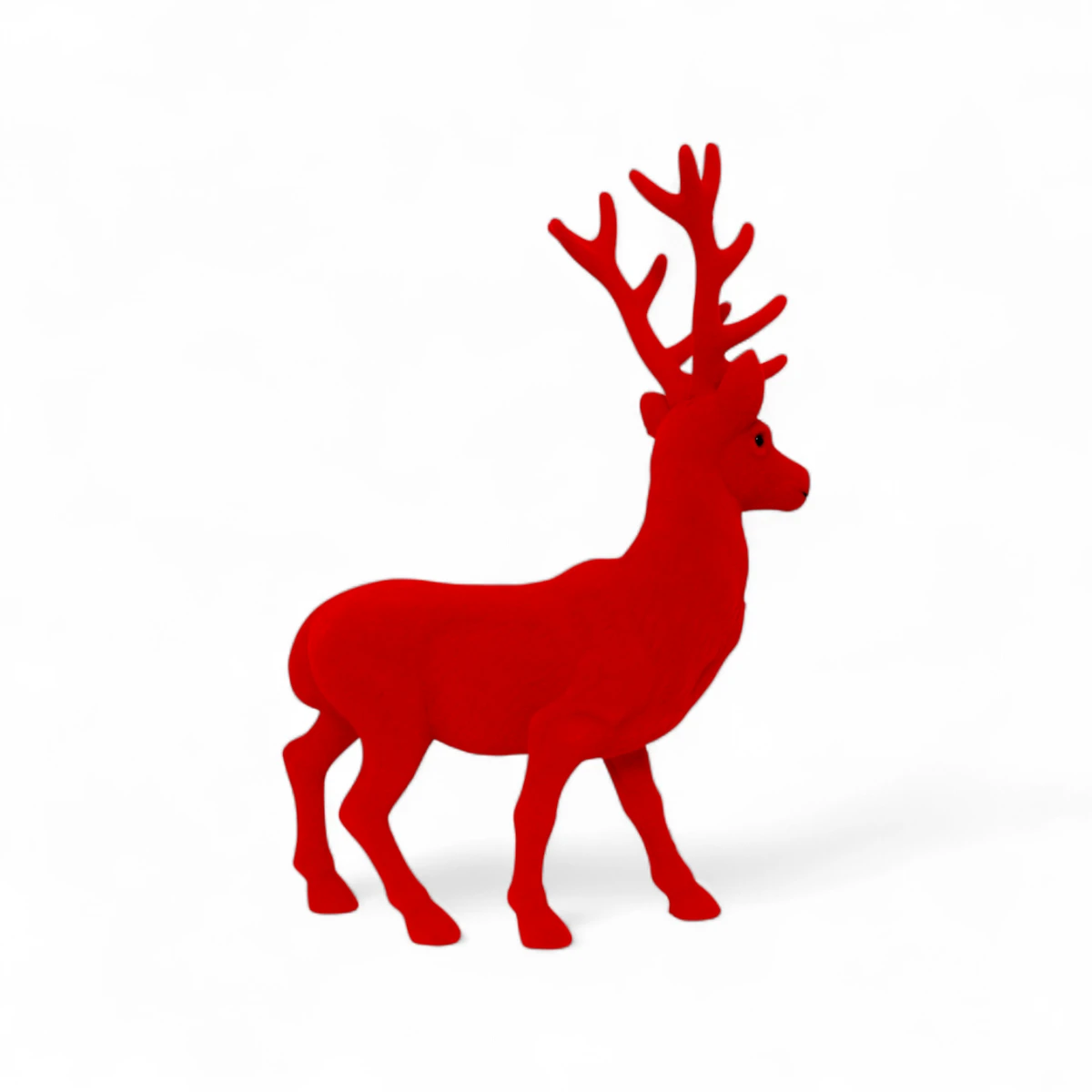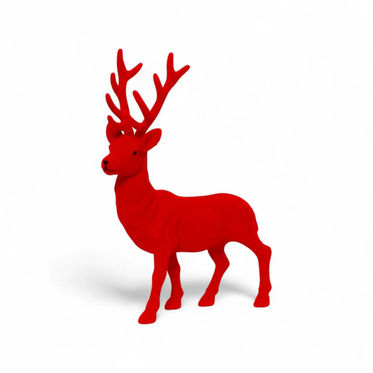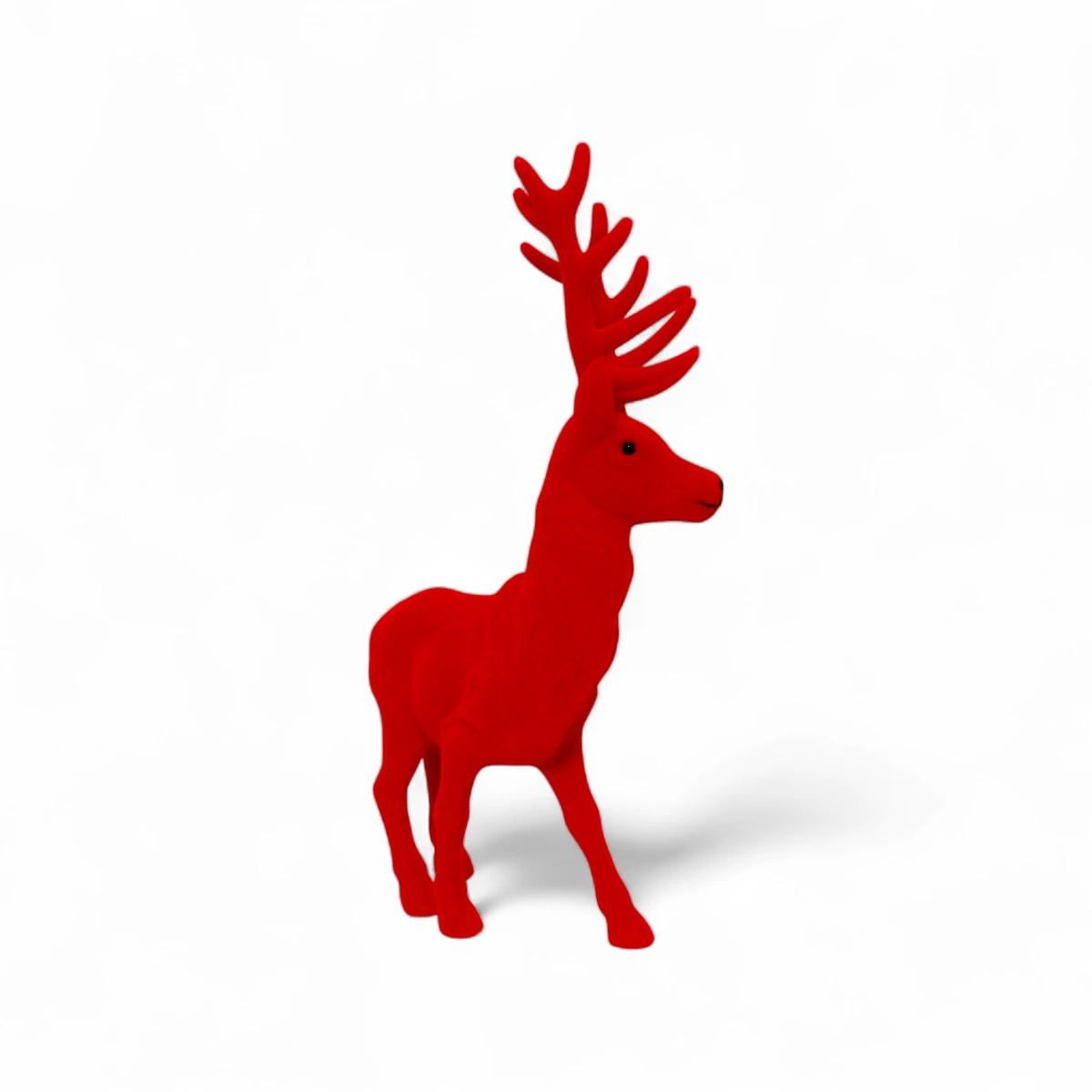 Dekoracyjna figurka świąteczna, renifer w intensywnie czerwonym kolorze. Stojący renifer wykonany jest z wysokiej jakości tworzywa sztucznego i pokryty w całości materiałem idealnie imitującym welur. Figurka jest lekka i bardzo miła w dotyku. Doskonale nadaje się na samodzielną dekorację stołu lub parapetu lub jako element kompozycji. Figurka renifera sprawdzi się też jako upominek lub dodatek do prezentu.