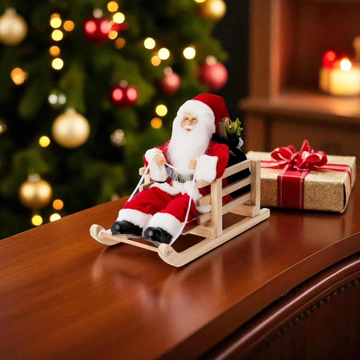 Świąteczna figurka Mikołaja siedzącego saniach, z zielonym workiem z prezentami. Mikołaj jest wykonany z wysokiej jakości tworzywa sztucznego i ubrany w czerwony strój z materiału syntetycznego imitującego welur i futerko. Drewniane sanie o wymiarach 15x28cm, wyglądają bardzo naturalnie i stabilnie stoją na podłożu. Figurka idealnie nadaje się na dekorację do domu, biura lub przedszkola. Świetnie sprawdzi się też jako świąteczny upominek.