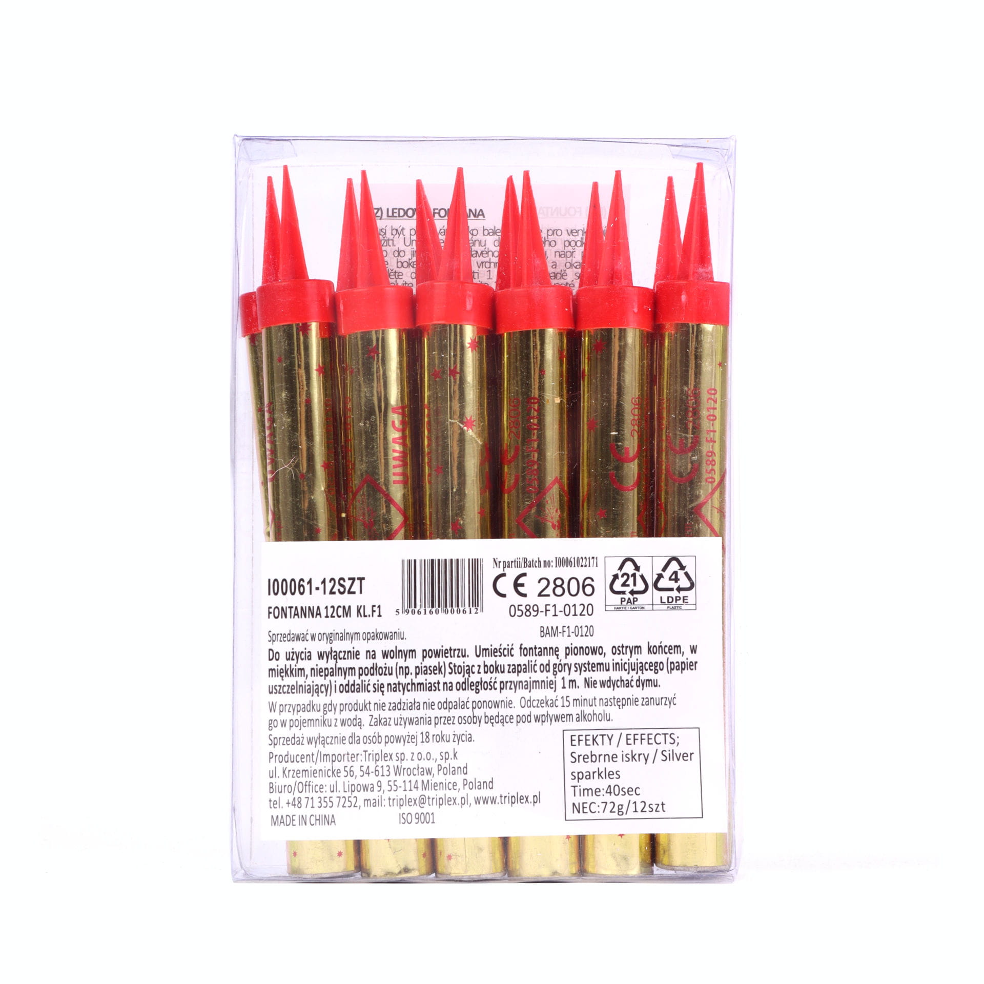 Fontanna posiada plastikową końcówkę zabezpieczającą. W celu odpalenia fontannę należy umieścić pionowo, następnie zapalić papier uszczelniający i niezwłocznie oddalić się na odległość ok.1 m. Do artykułu dołączona jest instrukcja obsługi. Produkt nie przeznaczony do użytku przez osoby poniżej 18 roku życia.