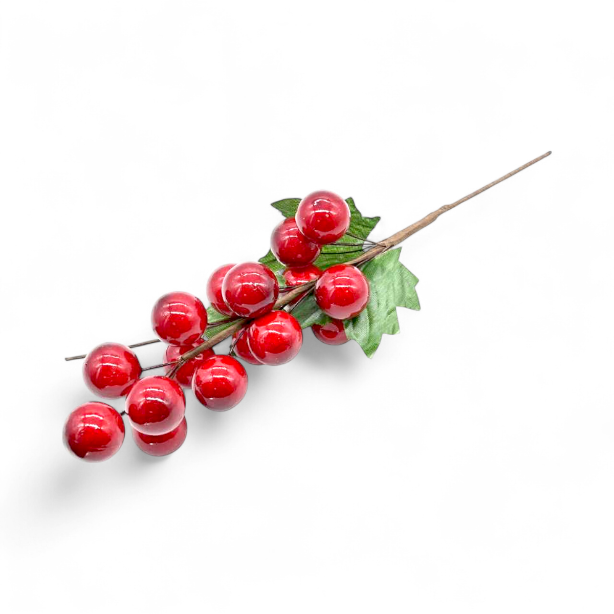 Gałązka świąteczna z głogiem, z błyszczącym wykończeniem. Ozdoba gałązka wykonana jest z tworzywa sztucznego oraz pianki. Kulki imitujące owoce głogu o średnicy ok. 3cm, umieszczone są na drucikach, można je oddzielić od całości i dowolnie wykorzystać. Gałązki łącza się w jedną elastyczną łodygę zabezpieczoną taśmą florystyczną, więc łatwo będzie umieścić dekorację w podłożu. Gałązki świąteczne to główny element dekoracji florystycznych o bożonarodzeniowym lub zimowym charakterze.