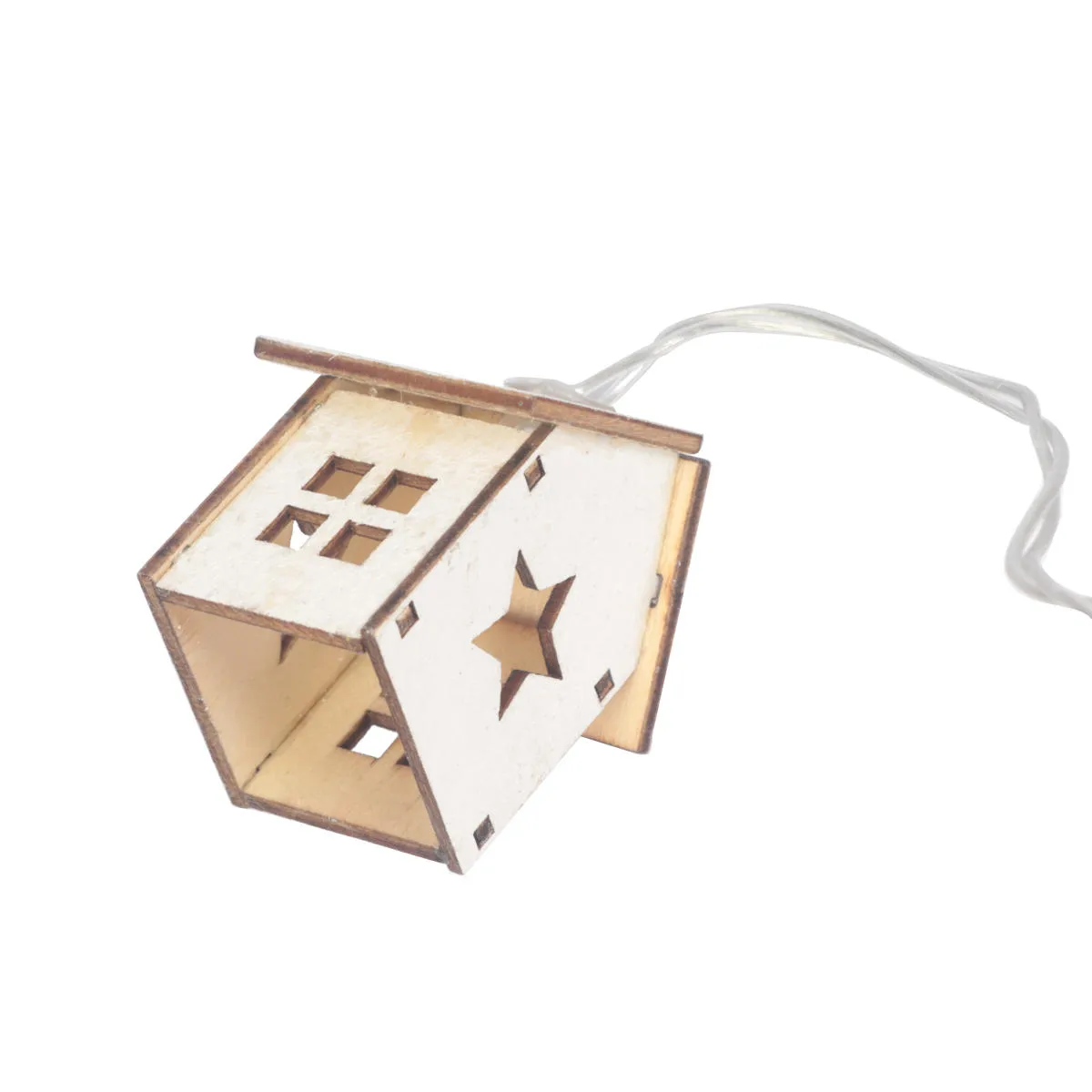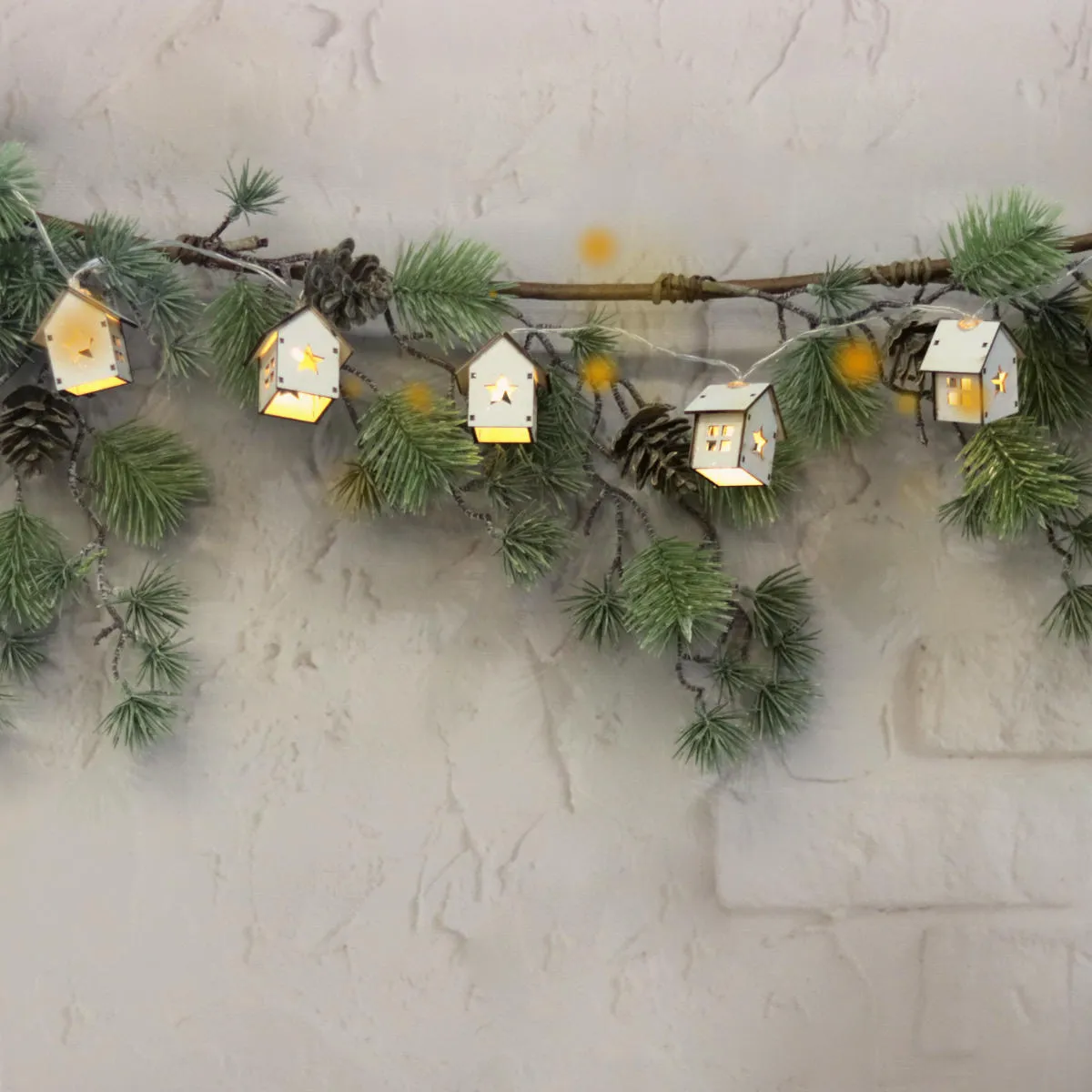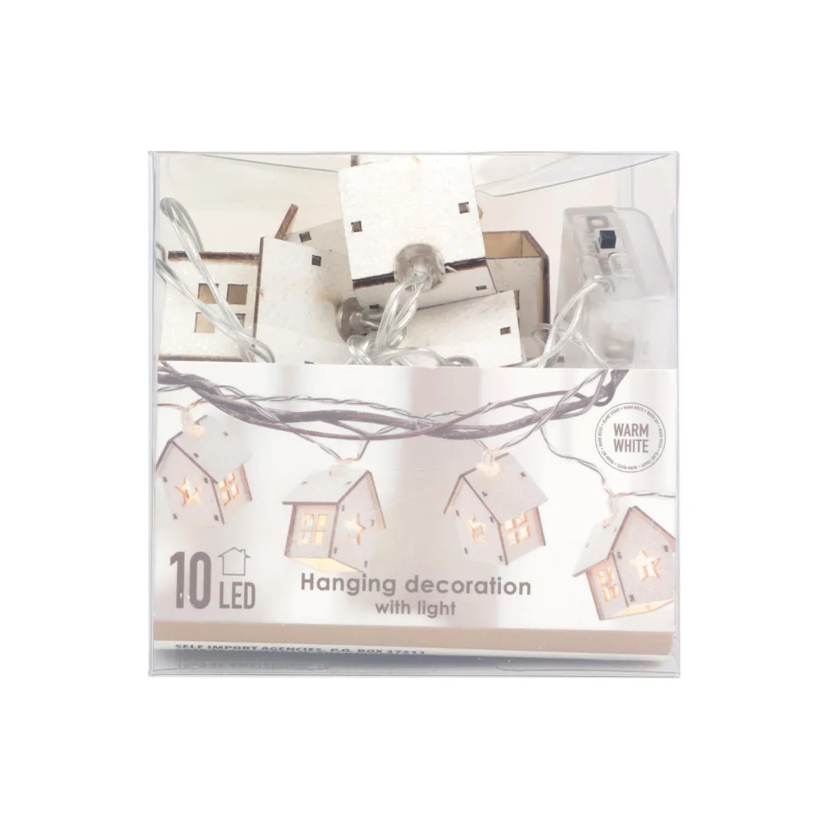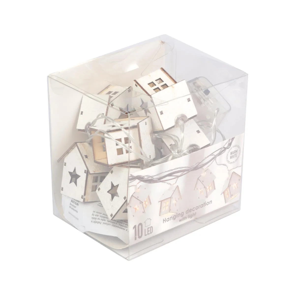 Dekoracyjne oświetlenie LED, drewniane domki z diodą. Girlanda świetlna składa się 10 lampek umieszczonych na przeźroczystym przewodzie, świecących białą, ciepłą barwą światłą. Łączna długość łańcucha to 130cm, a domki rozmieszczone są co 10cm. Diody zasilane są dwiema bateriami AA 1,5V (brak w zestawie). Produkt przeznaczony do użytku wewnątrz pomieszczeń.