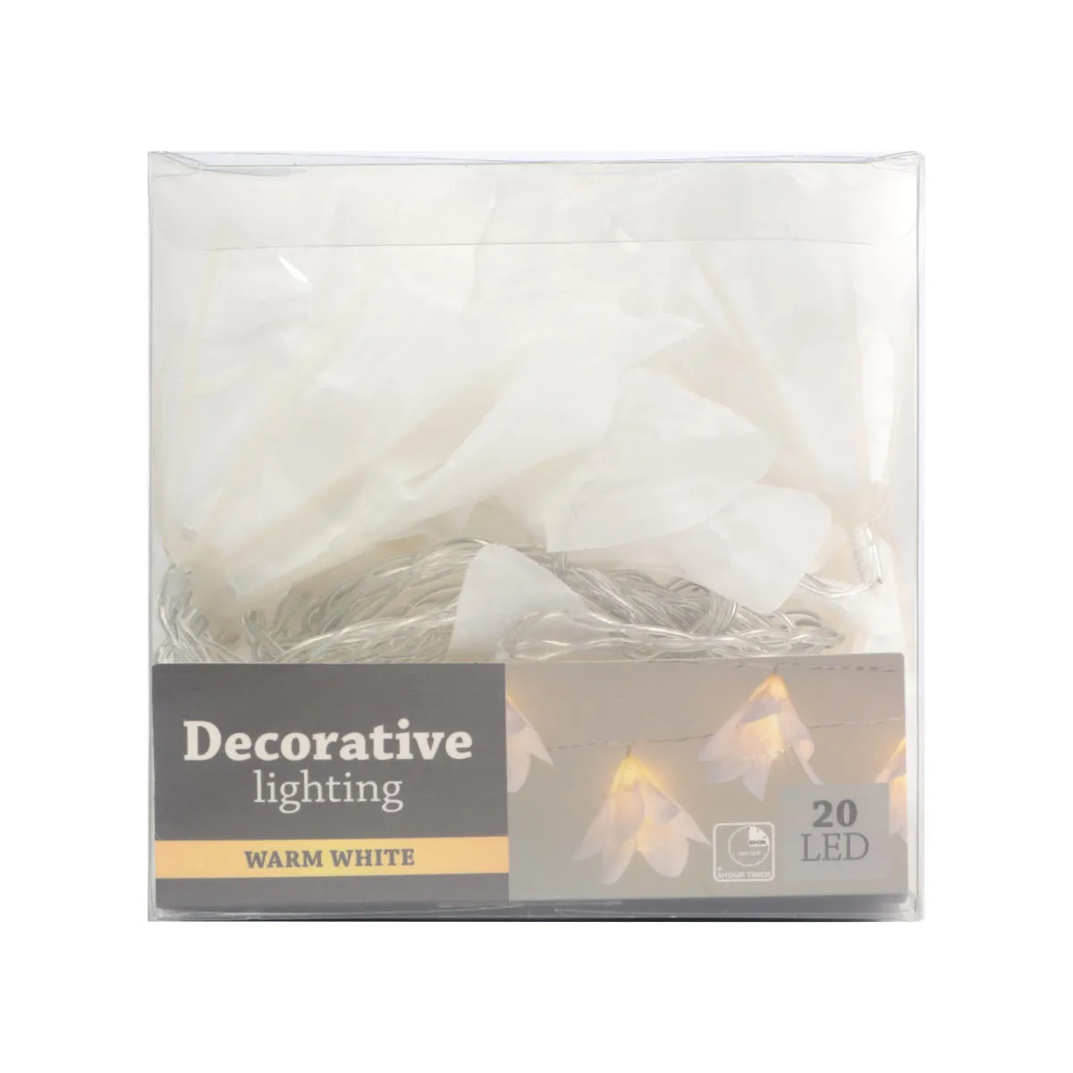 Dekoracyjne oświetlenie LED, białe kwiaty Magnolii o wielkości 9cm. Girlanda świetlna składa się 20 kwiatów umieszczonych na przeźroczystym przewodzie. Dioda umieszczona w każdym kwiatku oświetla ciepłym światłem jego liczne pręciki. Długość łańcucha to 380cm, a kwiaty rozmieszczone są co 20cm. Diody w lampkach zasilane są dwiema bateriami AA 1,5V (brak w zestawie). Produkt przeznaczony do użytku wewnątrz pomieszczeń. Dekoracja posiada funkcję Timer 6h/18h, która pozwala na ustawienie czasu pracy. Po włączeniu tej funkcji diody świecą przez 6 godzin, a przez następne 18 godzin pozostają wyłączone.