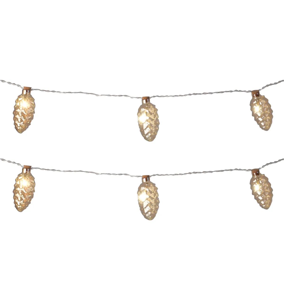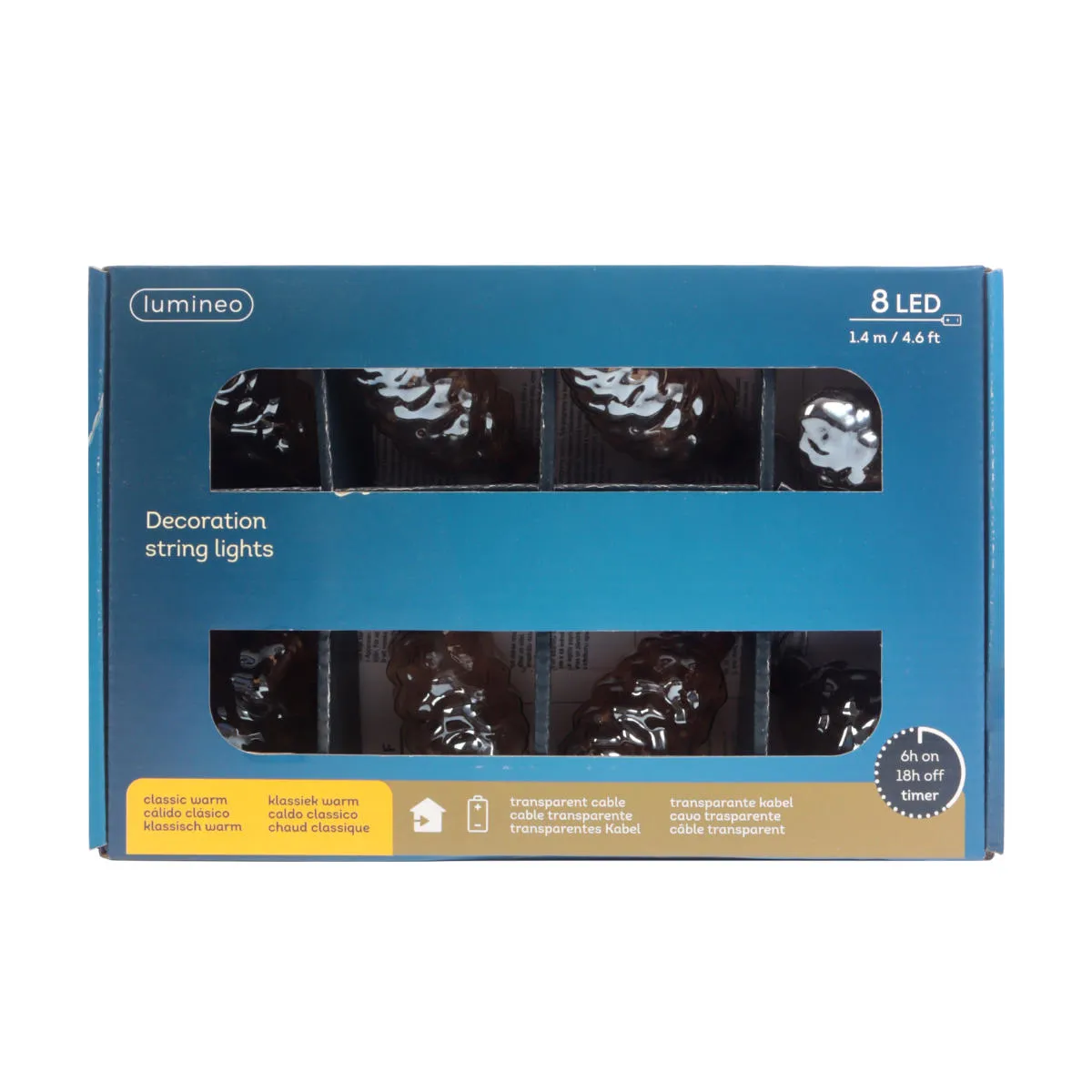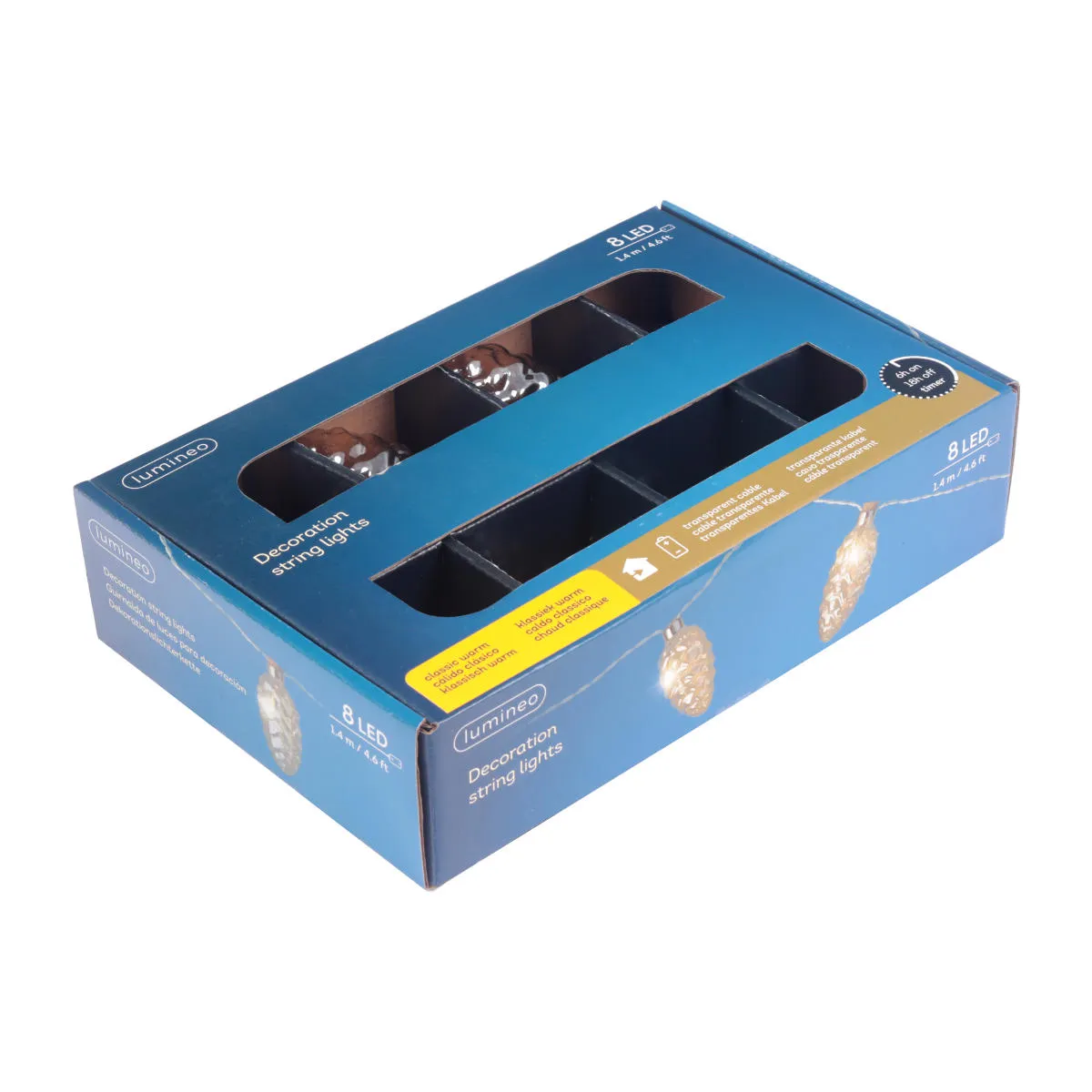 Dekoracyjne oświetlenie LED, szklane szyszki z diodą. Girlanda świetlna składa się 8 lampek umieszczonych na przeźroczystym przewodzie, świecących białą, ciepłą barwą światłą. Łączna długość łańcucha to 175cm, a szyszki rozmieszczone są co 15cm. Diody w lampkach zasilane są dwiema bateriami AA 1,5V (brak w zestawie). Produkt przeznaczony do użytku wewnątrz pomieszczeń. Dekoracja posiada funkcję Timer 6h/18h, która pozwala na ustawienie czasu pracy. Po włączeniu tej funkcji diody świecą przez 6 godzin, a przez następne 18 godzin pozostają wyłączone.