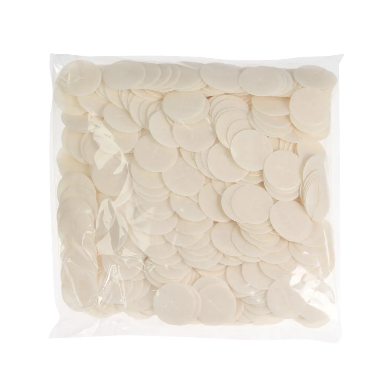 Komunikanty mszalne o średnicy 3,5cm, z widocznym obustronnie wytłoczonym znakiem krzyża.
