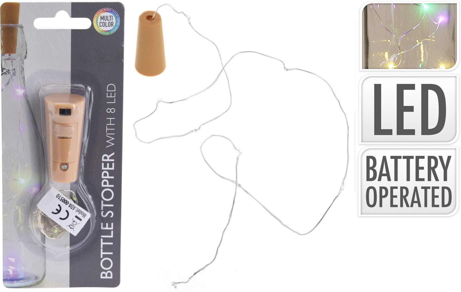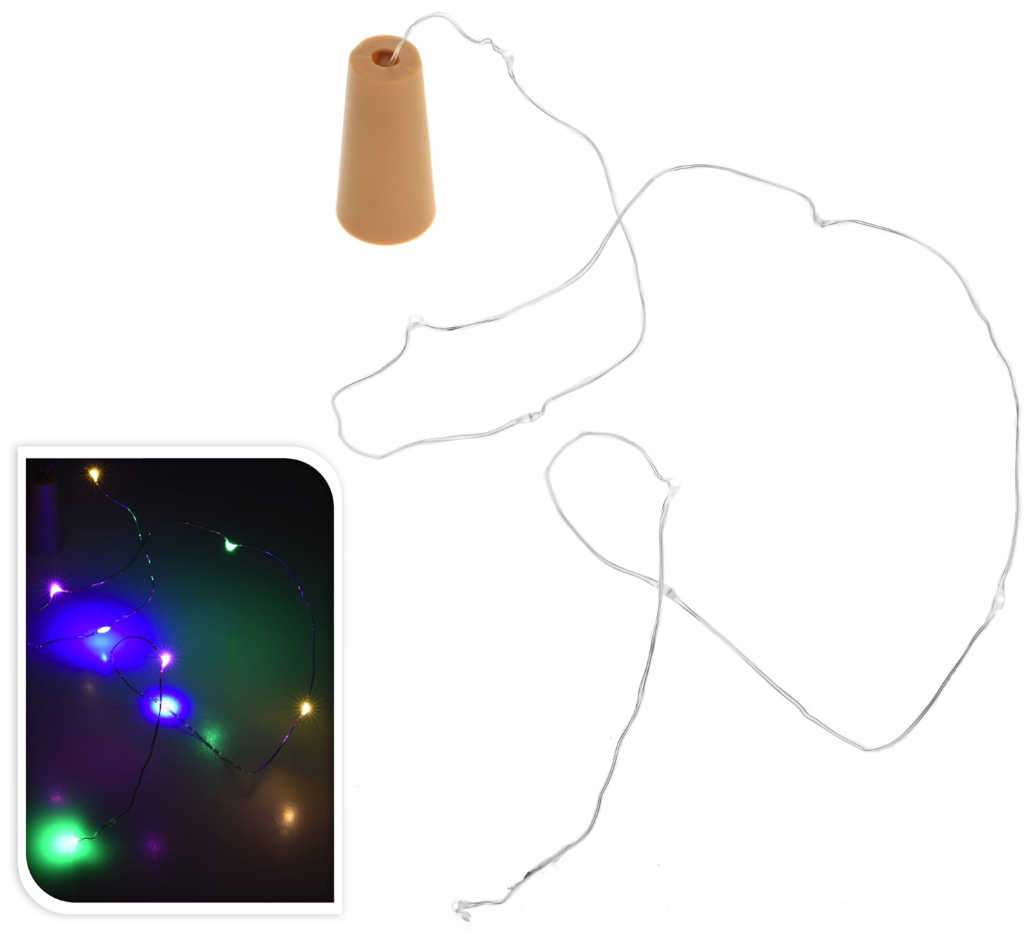 Korek do butelki LED z kolorowymi diodami RGB. Diody znajdują się na druciku, zasilane są bateriami znajdującymi się w korku. Diody nie zmieniają barwy, świecą się w sposób ciągły w wybranym kolorze: niebieskim, fioletowym, czerwonym, żółtym, różowym. Elastyczny i lekki drucik umożliwia równomierne rozłożenie się diod w butelce. Średnica plastikowego korka to 23mm, jest uniwersalna i pasuje do większości butelek po winie lub oranżadzie czy sokach.