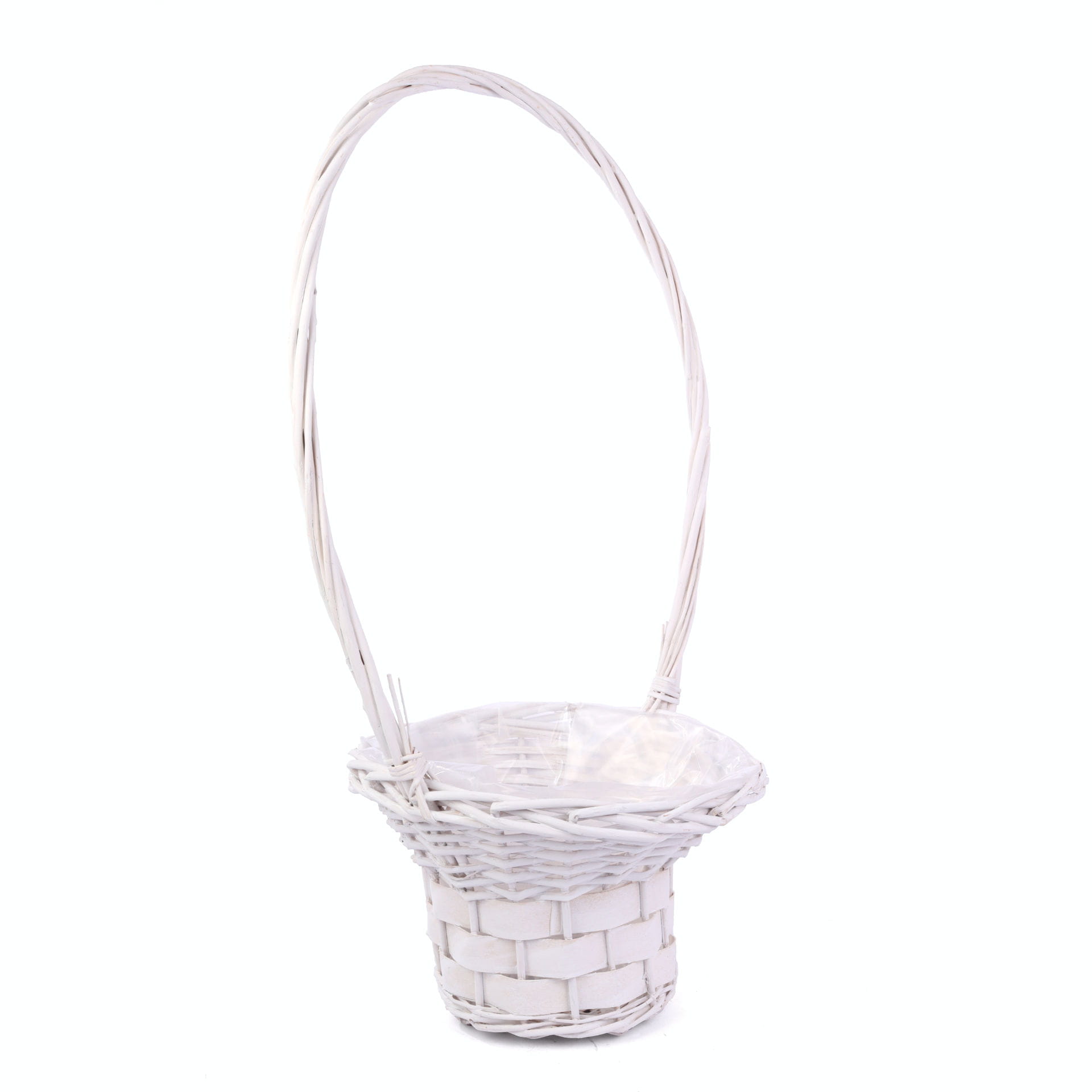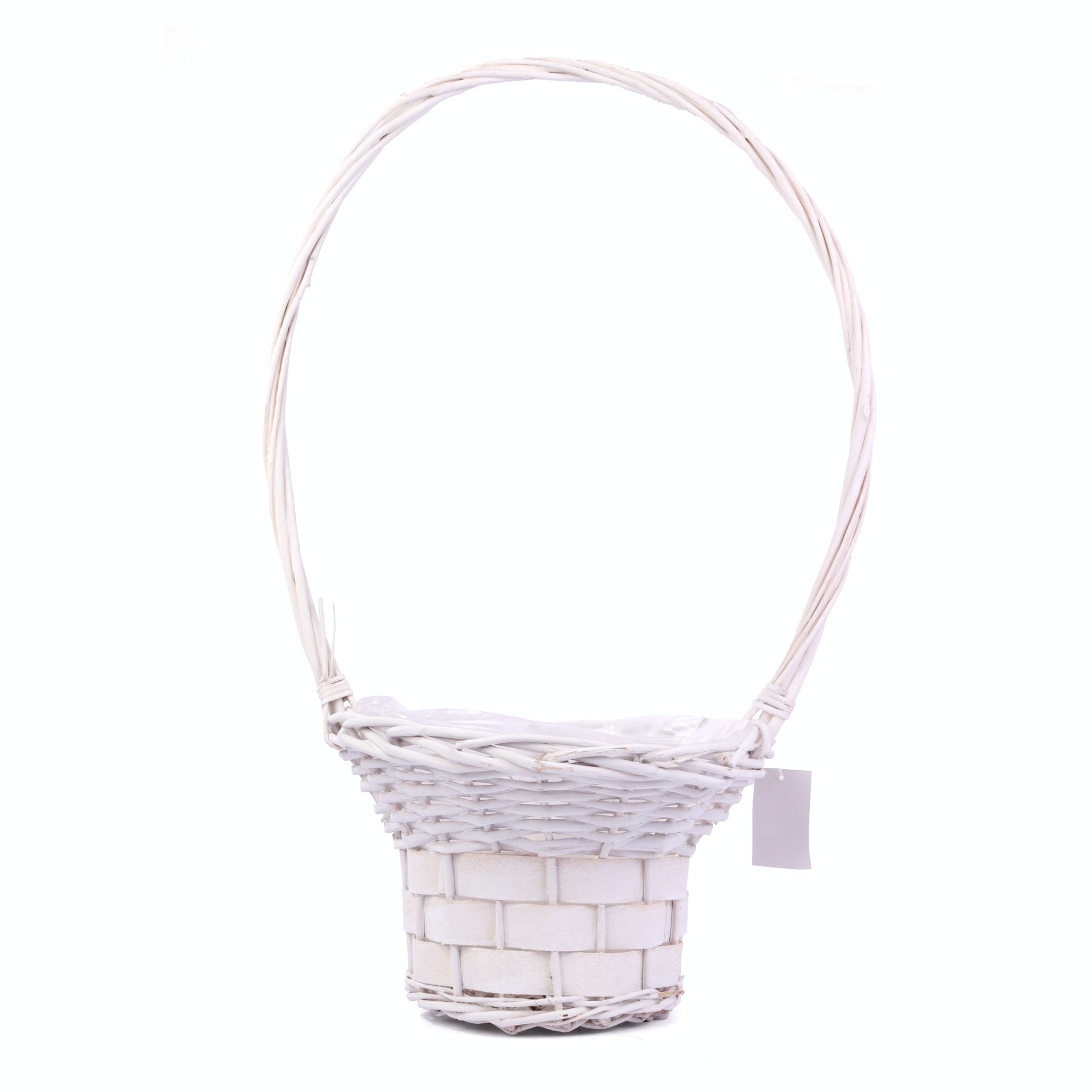Kosz kwiatowy z pałąkiem, wykonany z wykliny. Kosz jest w kolorze białym, idealnie nadaje się do różnych kompozycji kwiatowych. Wokół dekoracji z dartki drzewnej posiada ozdobny skrętny wzór. Wnętrze kosza wyściełane jest folią, dzięki czemu można stosować także mokrą gąbkę florystyczną do żywych kwiatów. Ze względu na wymiary najczęściej stosowany jest jako dekoracja na Ślub, I komunię, lub wesele.