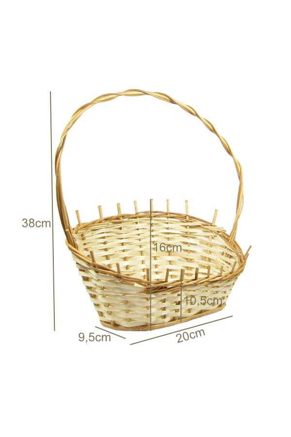 Prezentowy koszt kwiatowy z rączką, wyplatany z jasnej wikliny. Dzięki swojemu kształtowi kosz idealnie nadaje się do kwiatów lub upominków delikatesowych. Produkt wyplatany jest ręcznie, wymiary mogą nieznacznie różnić się od poglądowych, przedstawionych na rysunku.