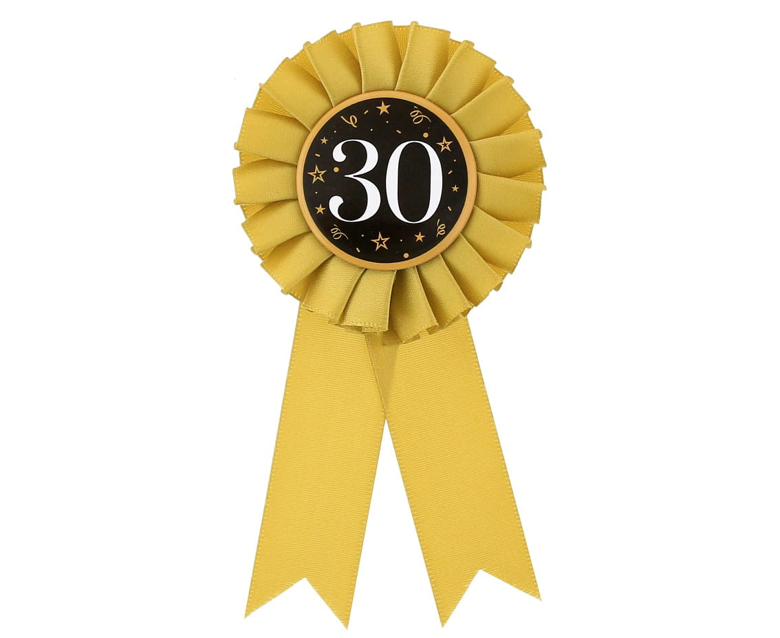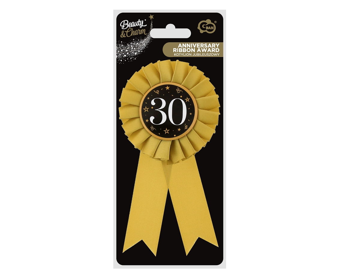 Kotylion urodzinowy z cyfrą 30, wykonany z wysokiej jakości materiałów, mocowany na niewielką agrafkę.