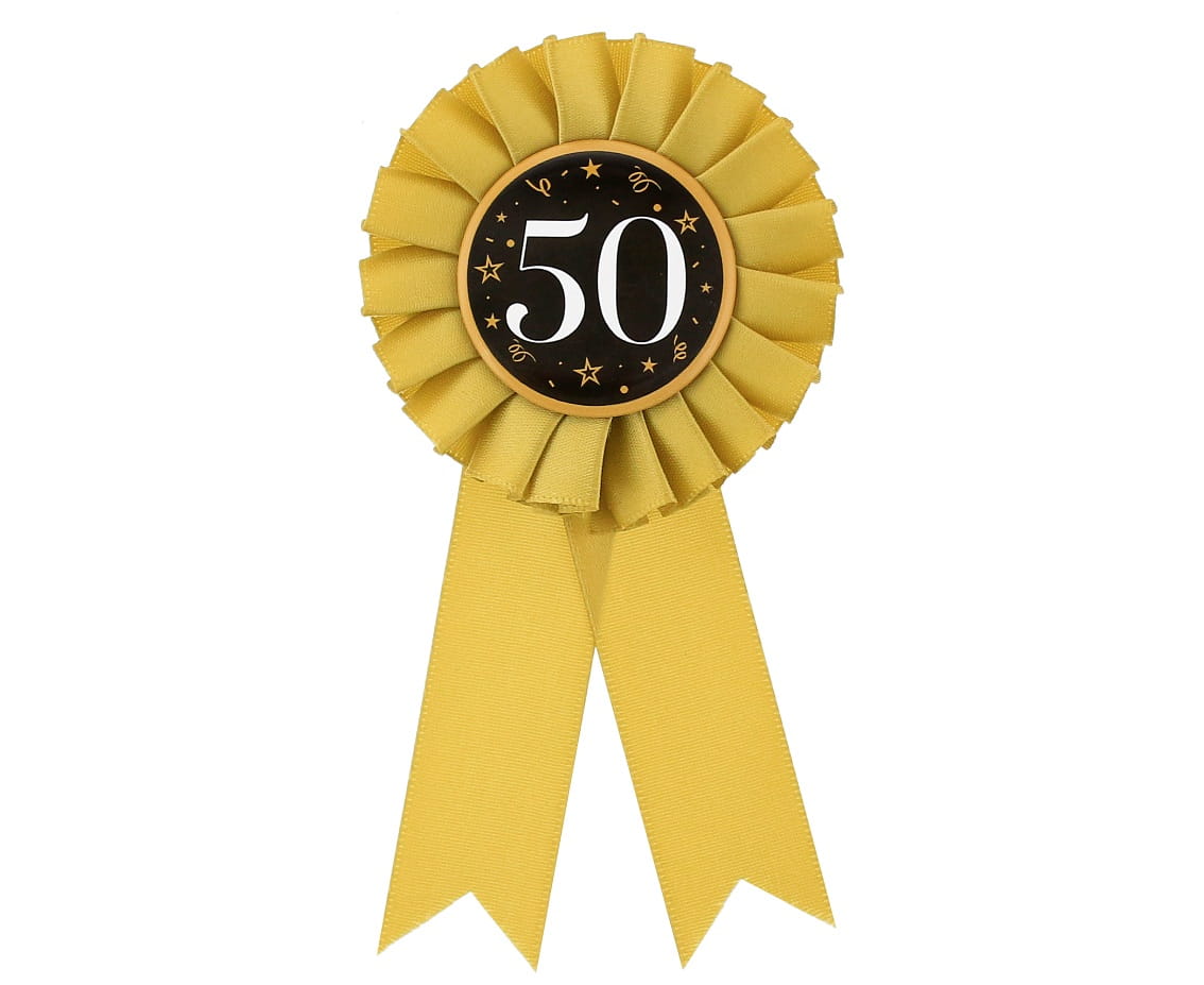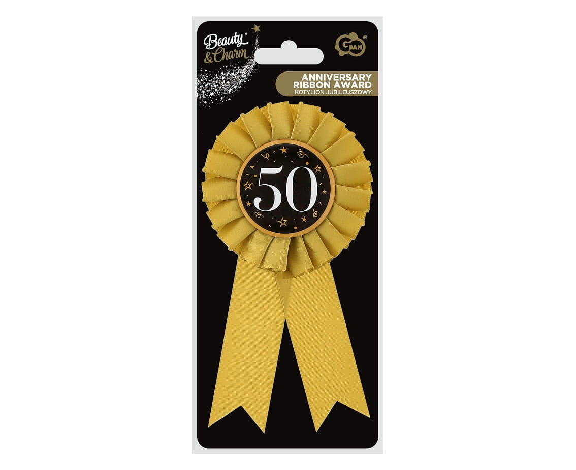 Kotylion urodzinowy z cyfrą 50, wykonany z wysokiej jakości materiałów, mocowany na niewielką agrafkę.