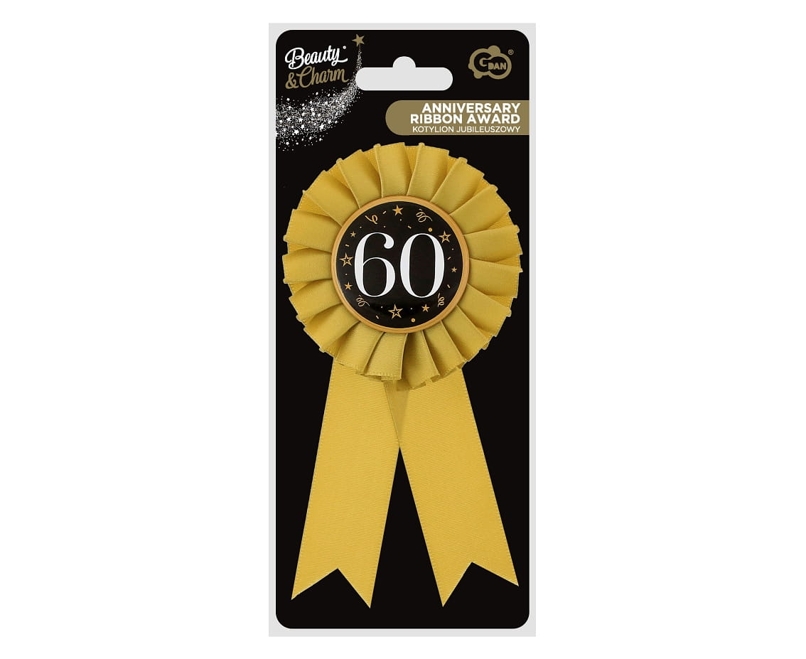Kotylion urodzinowy z cyfrą 60, wykonany z wysokiej jakości materiałów, mocowany na niewielką agrafkę.
