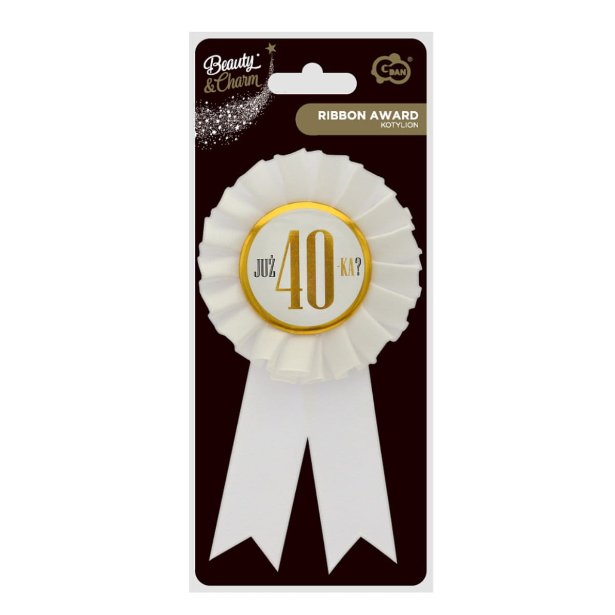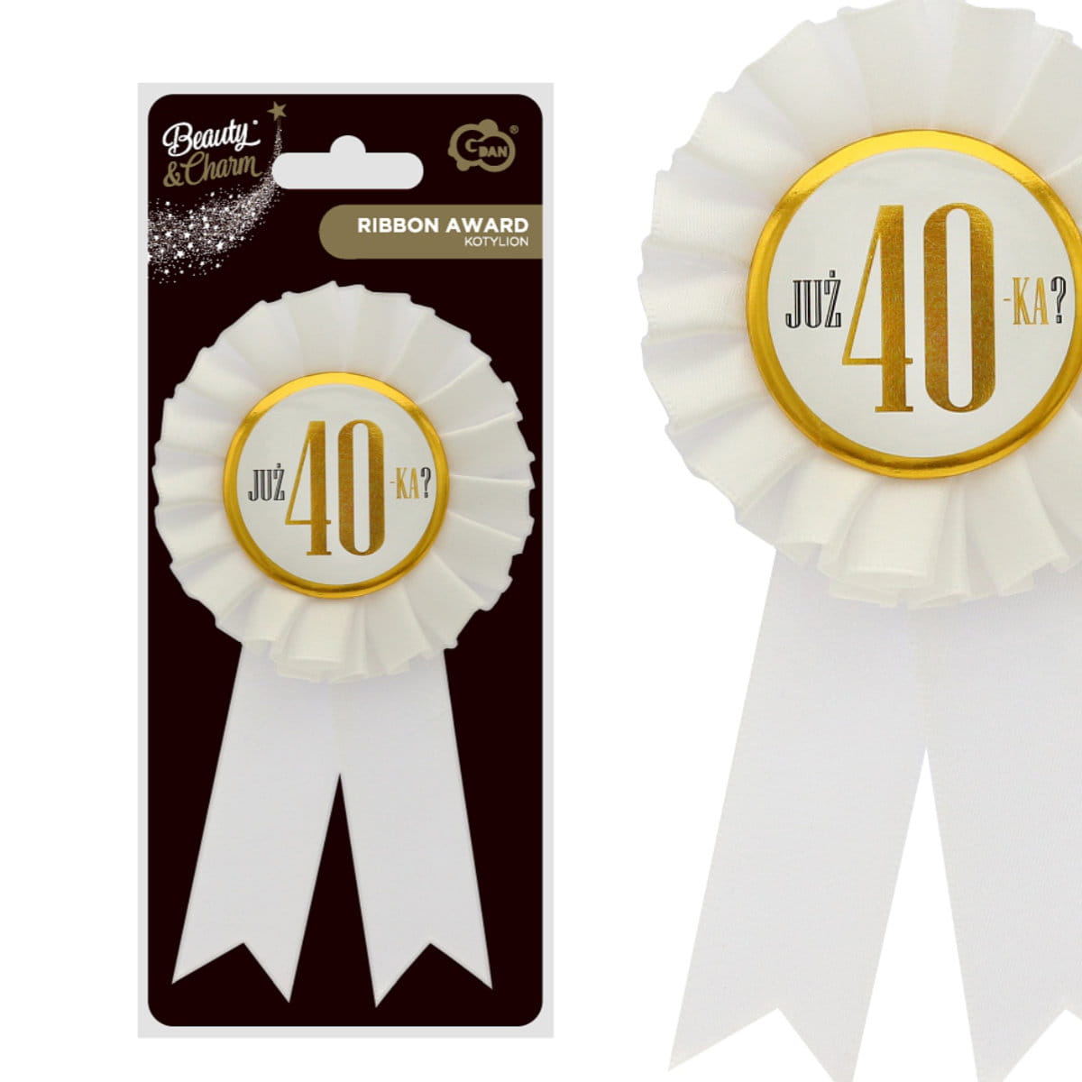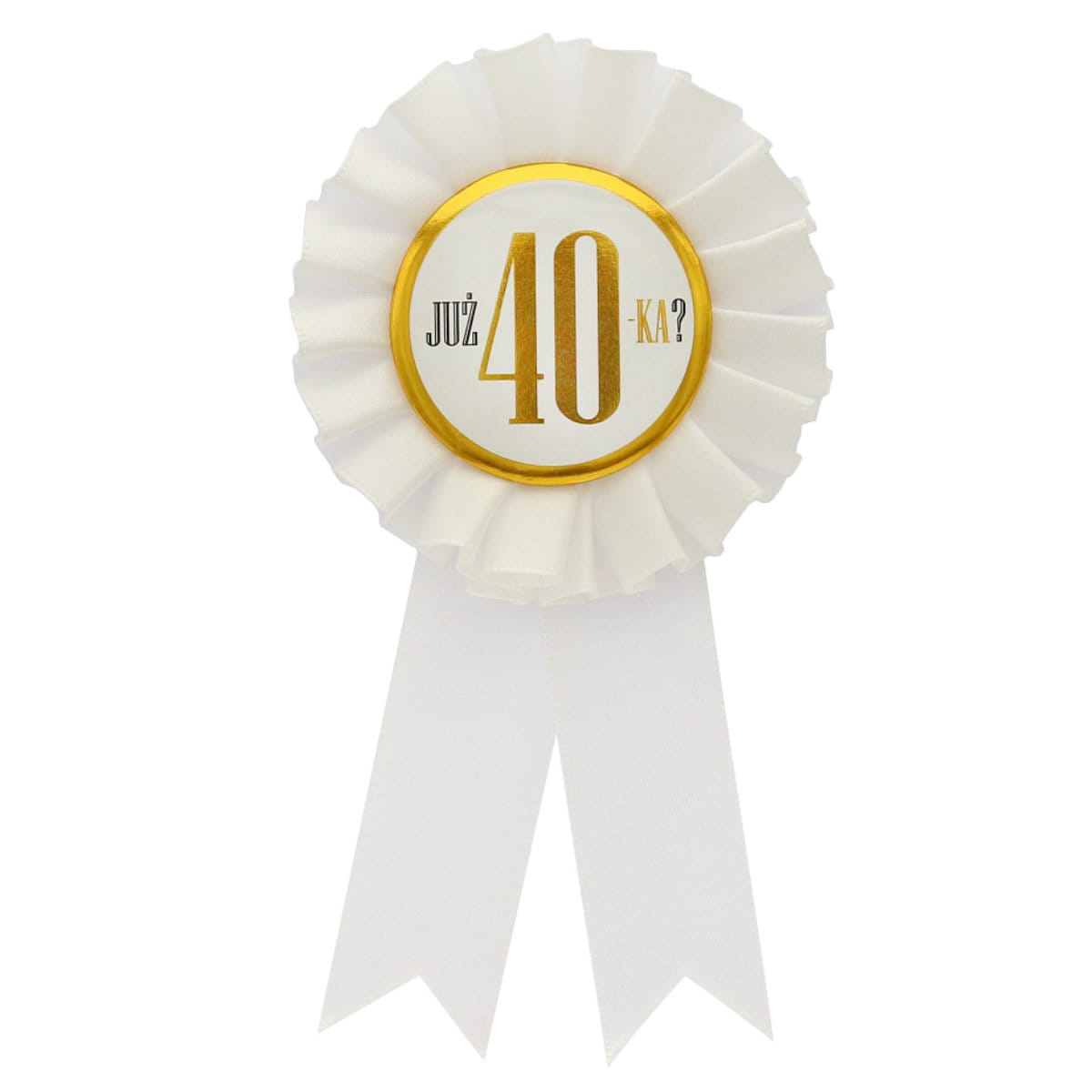 Kotylion urodzinowy z napisem Już 40-tka?, w kolorze białym. Wykonany z wysokiej jakości materiałów, mocowany na niewielką agrafkę.