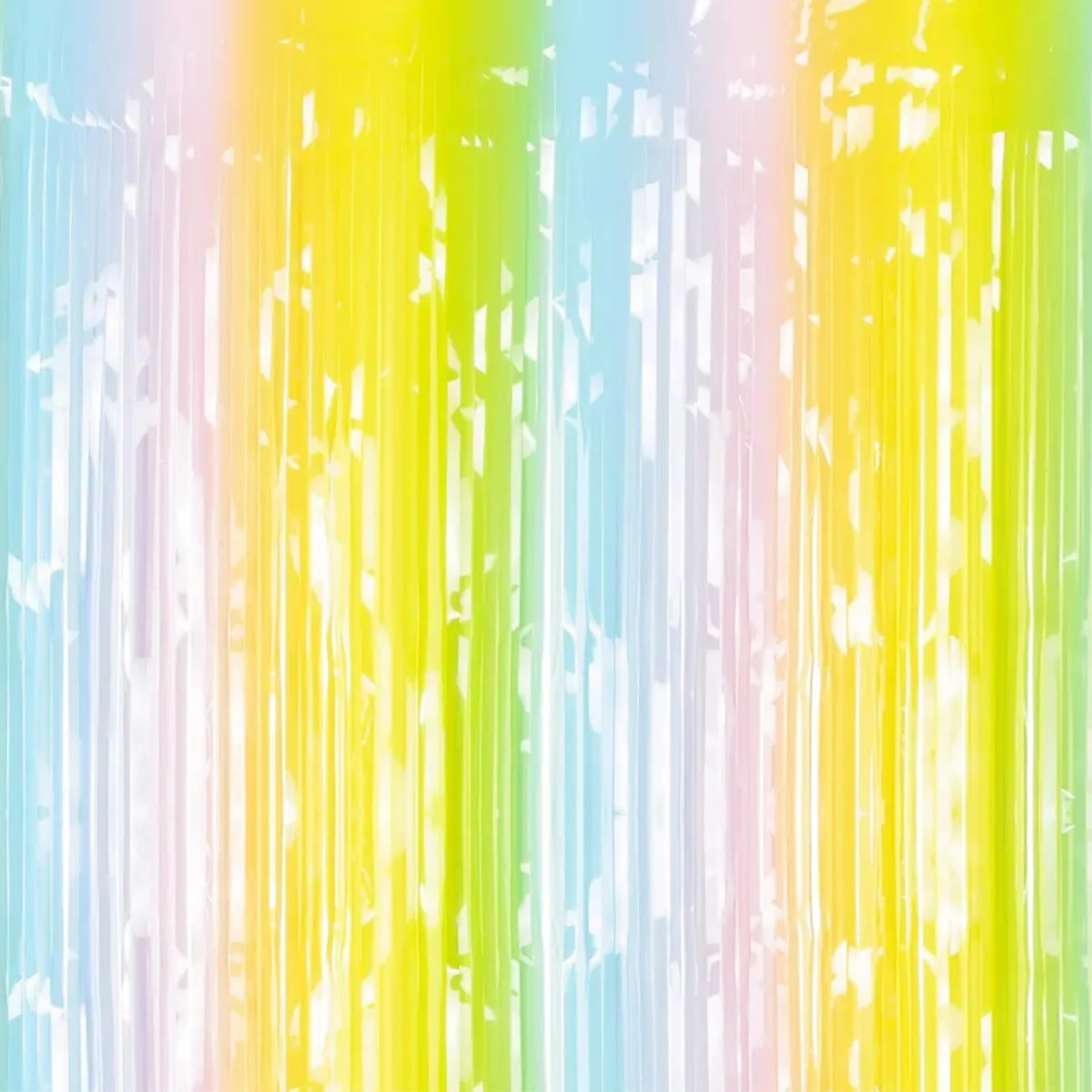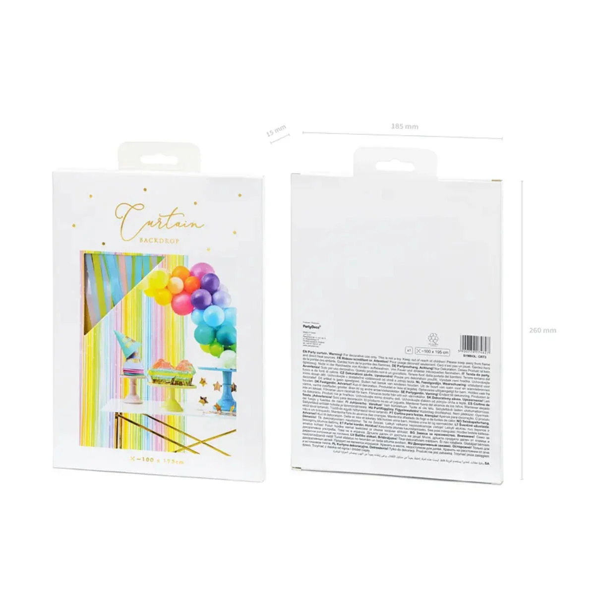 Dekoracja w postaci kolorowej kurtyny. Kurtyna wykonana z wysokiej jakości folii, pociętej w długie, wąskie paski. Idealnie nadaje się jako ozdoba drzwi, ściany lub okna. Może służyć również jako element scenografii i tło do zdjęć. Kurtyna w delikatnych, pastelowych kolorach, ma wysokość 195cm i szerokość 100cm. Posiada otwory do zawieszania i jest zapakowana w estetyczny kartonik.