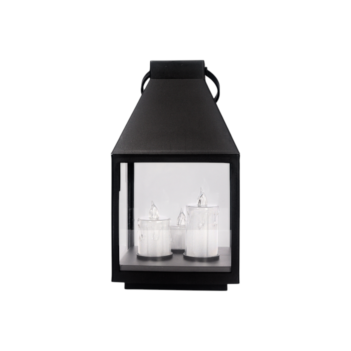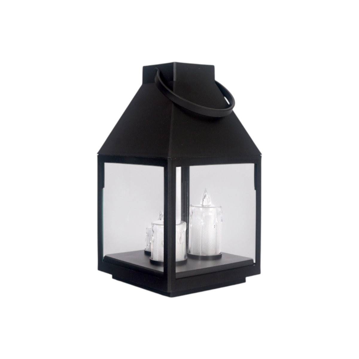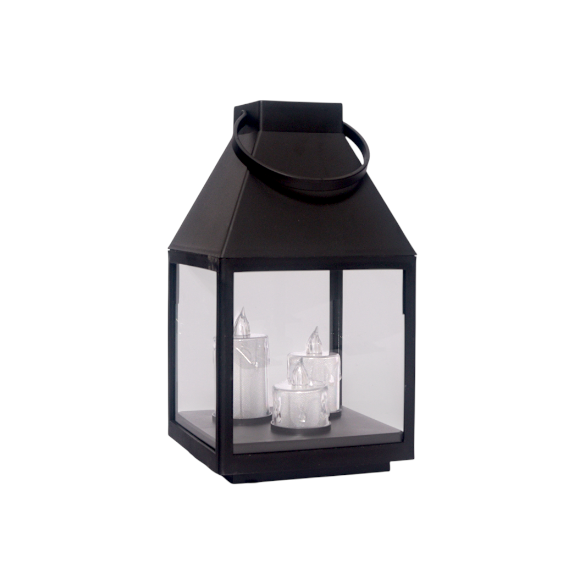 Lampion o wysokości 25cm, z trzema świeczkami LED. Czarny lampion wykonany z wysokiej jakości tworzywa sztucznego. Posiada 3 różnej wielkości świeczki LED, które po włączeniu świecą ciepłym światłem. Lampion o prostym, klasycznym kształcie, z wygodną rączką. Nadaje się do postawienia lub zawieszenia w dowolnym miejscu. Może służyć jako samodzielna ozdoba lub element wianka i stroika. Wyposażony jest w funkcję Timer 6h/18h, która pozwala na ustawienie czasu pracy. Po włączeniu tej funkcji dioda świeci przez 6 godzin, a przez następne 18 godzin pozostaje wyłączona. Diody w świeczkach zasilane są trzema bateriami typu AAA (brak w zestawie).