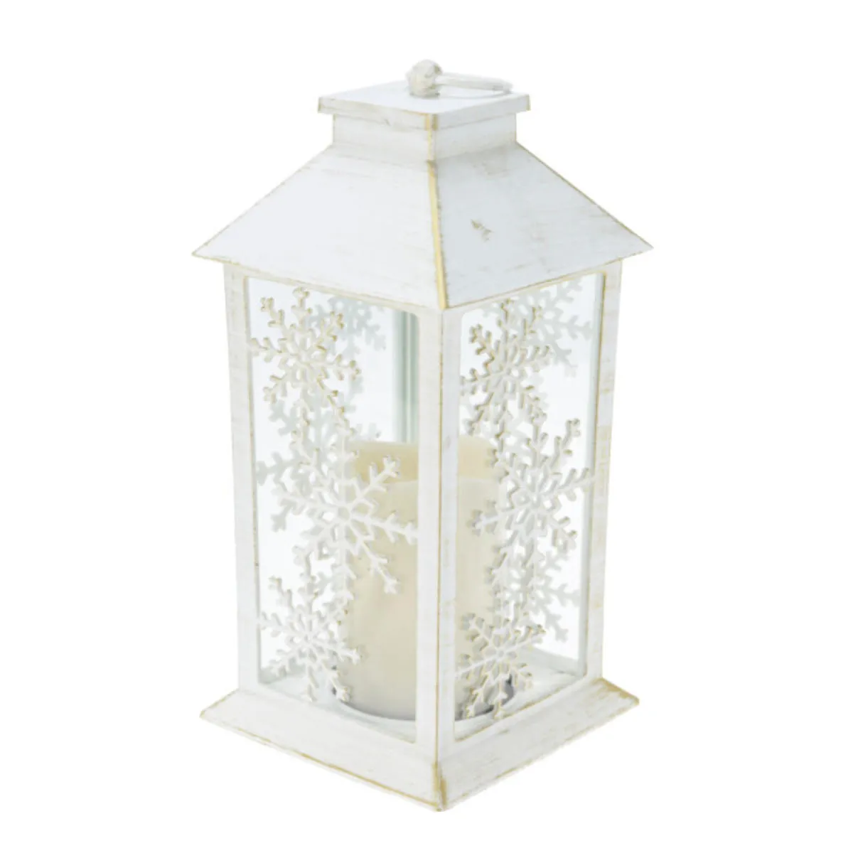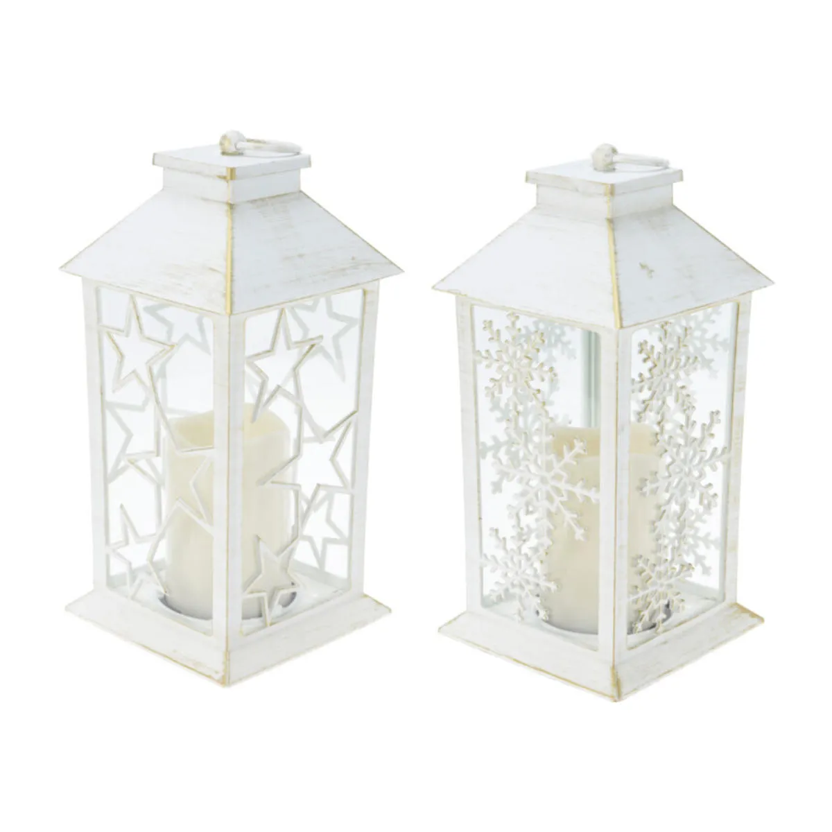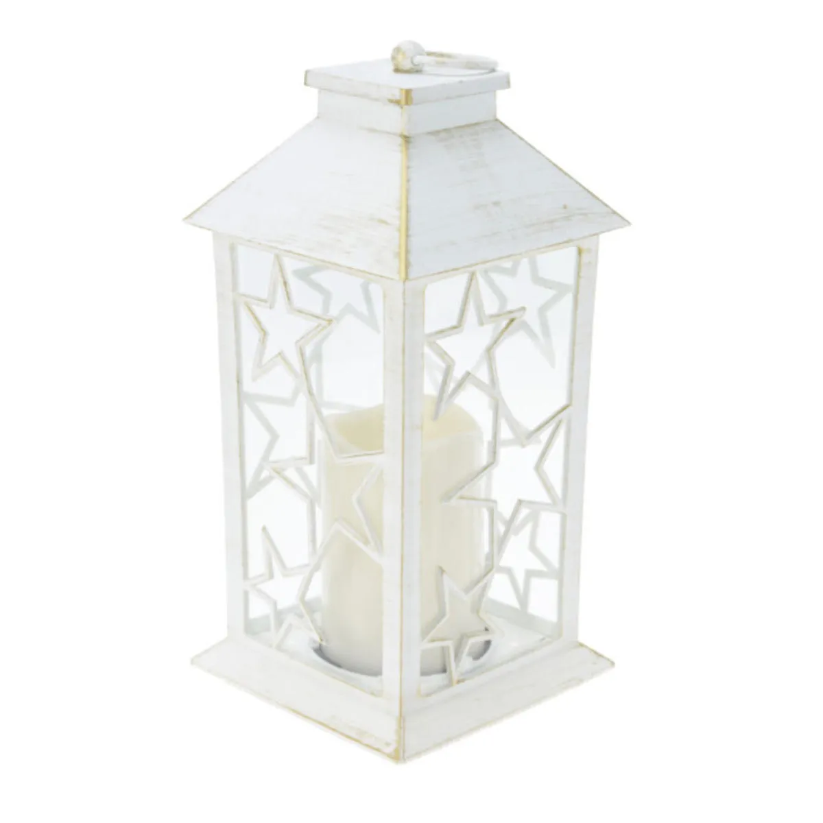 Świąteczna latarenka LED, zasilana bateriami. Biały lampion, wykonany z wysokiej jakości tworzywa sztucznego, ozdobiony wzorem gwiazdek lub śnieżynek. Posiada wbudowaną świecę LED, z białym, ciepłym światłem. Wyposażony jest w funkcję Timer 6h/18h, która pozwala na ustawienie czasu pracy. Po włączeniu tej funkcji dioda świeci przez 6 godzin, a przez następne 18 godzin pozostaje wyłączona. Lampion ma klasyczny kształt latarenki i jest bardzo lekki. Nadaje się do postawienia lub zawieszenia w dowolnym miejscu, a rączka umożliwia szybkie przestawianie lampki. Dostępny jest w dwóch wariantach do wyboru. Podana cena dotyczy 1 sztuki z wybranego wzoru. Oświetlenie nadaje się do użytku wewnątrz pomieszczeń.