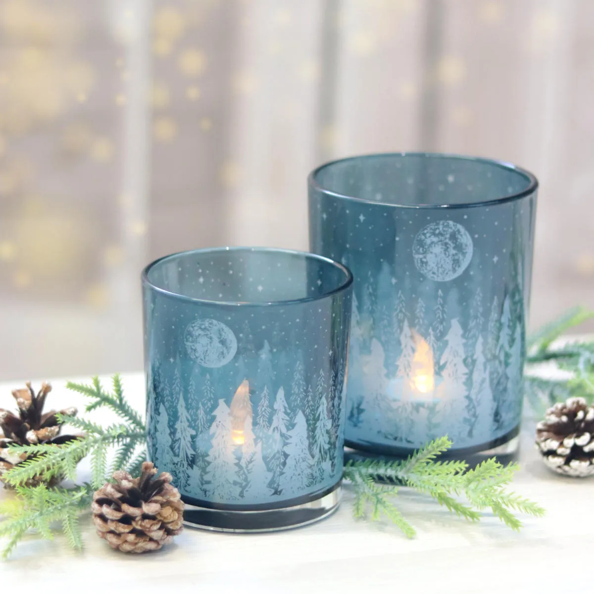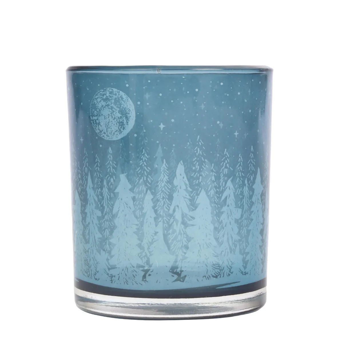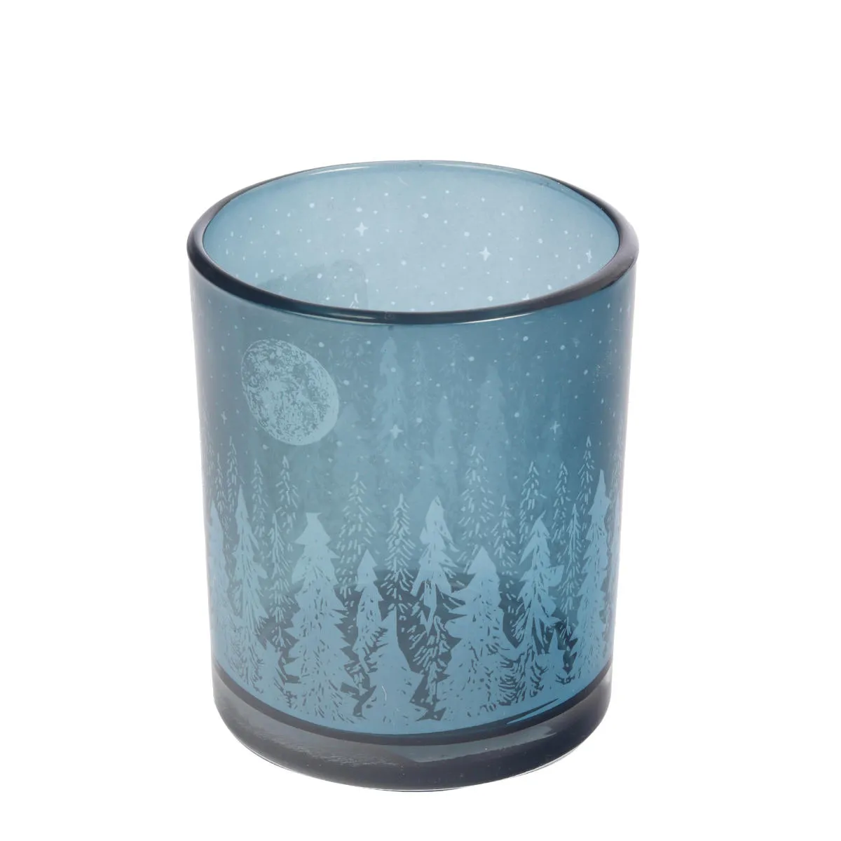 Świąteczny, dekoracyjny lampion na świeczkę typu tealight, o wysokości 10cm. Niebieski, półprzeźroczysty świecznik wykonany jest z grubego szkła. Lampion ozdobiony jest białym wzorem przedstawiającym nocny, ośnieżony las. Idealnie nadaje się na dekorację stołu, komody lub parapetu oraz jako element stroika. Będzie tez świetnym pomysłem na świąteczny upominek. Lampion przeznaczony jest na świeczki typu tealight.