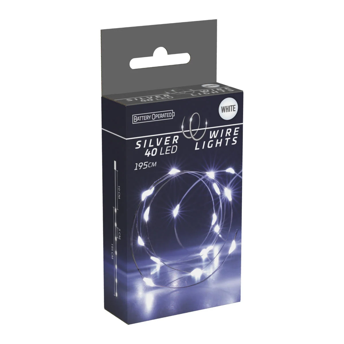 Lampki choinkowe LED 40 diod. Diody w kształcie łezki mają wielkość 5mm. Umieszczone są na srebrnym druciku o długości 195cm. Świecą stałym światłem o zimnej barwie. Całość zasilana jest na baterie 3 x AA 1,5V (nie są częścią zestawu). Dzięki takiej formie, lampki możemy używać w dowolnym miejscu. Lampki przeznaczone do użytku wewnątrz pomieszczeń.