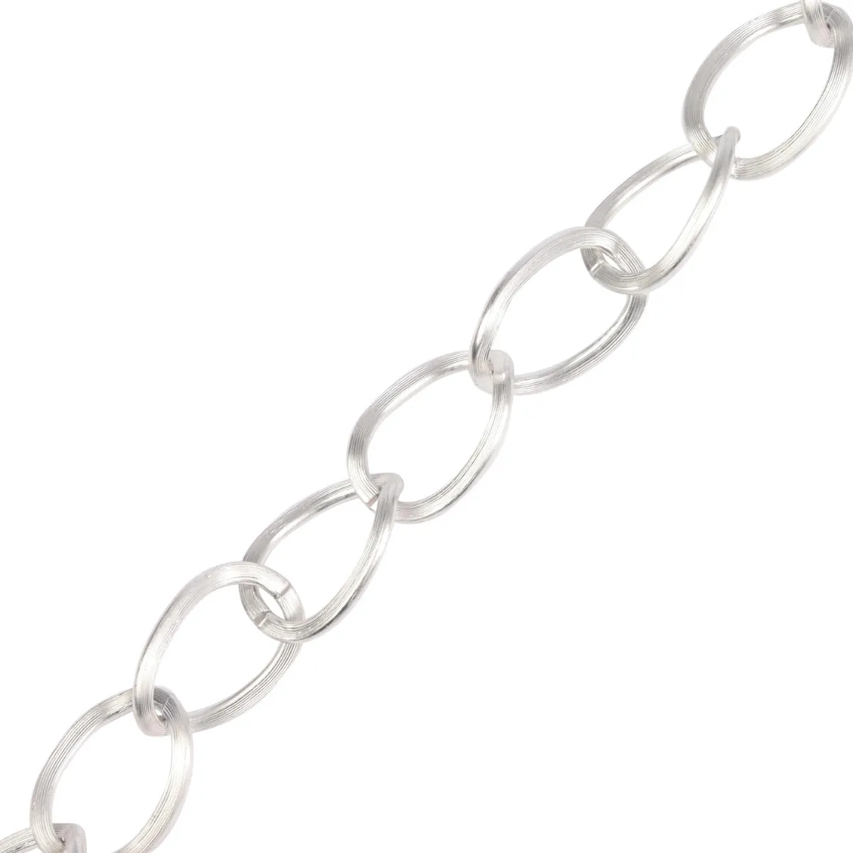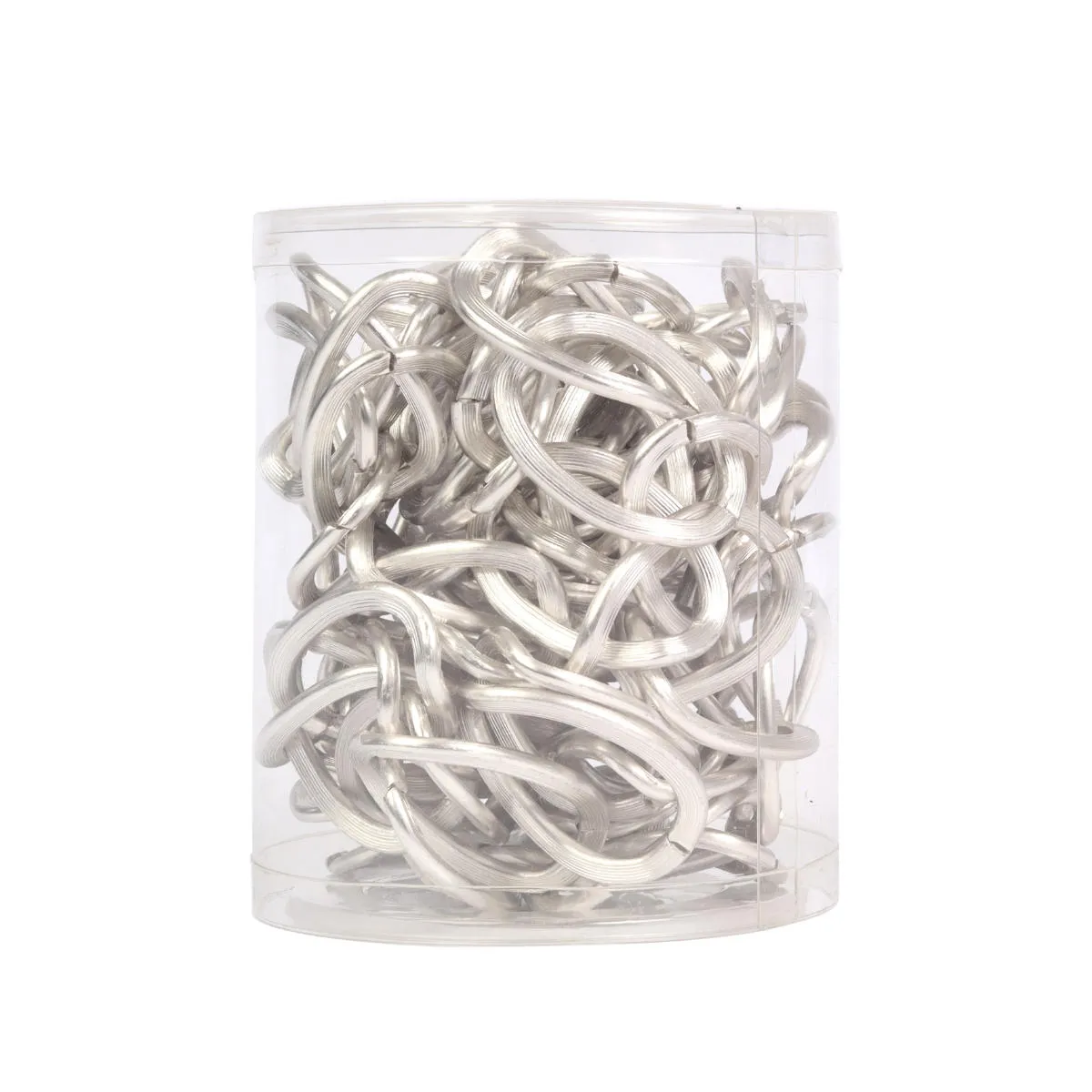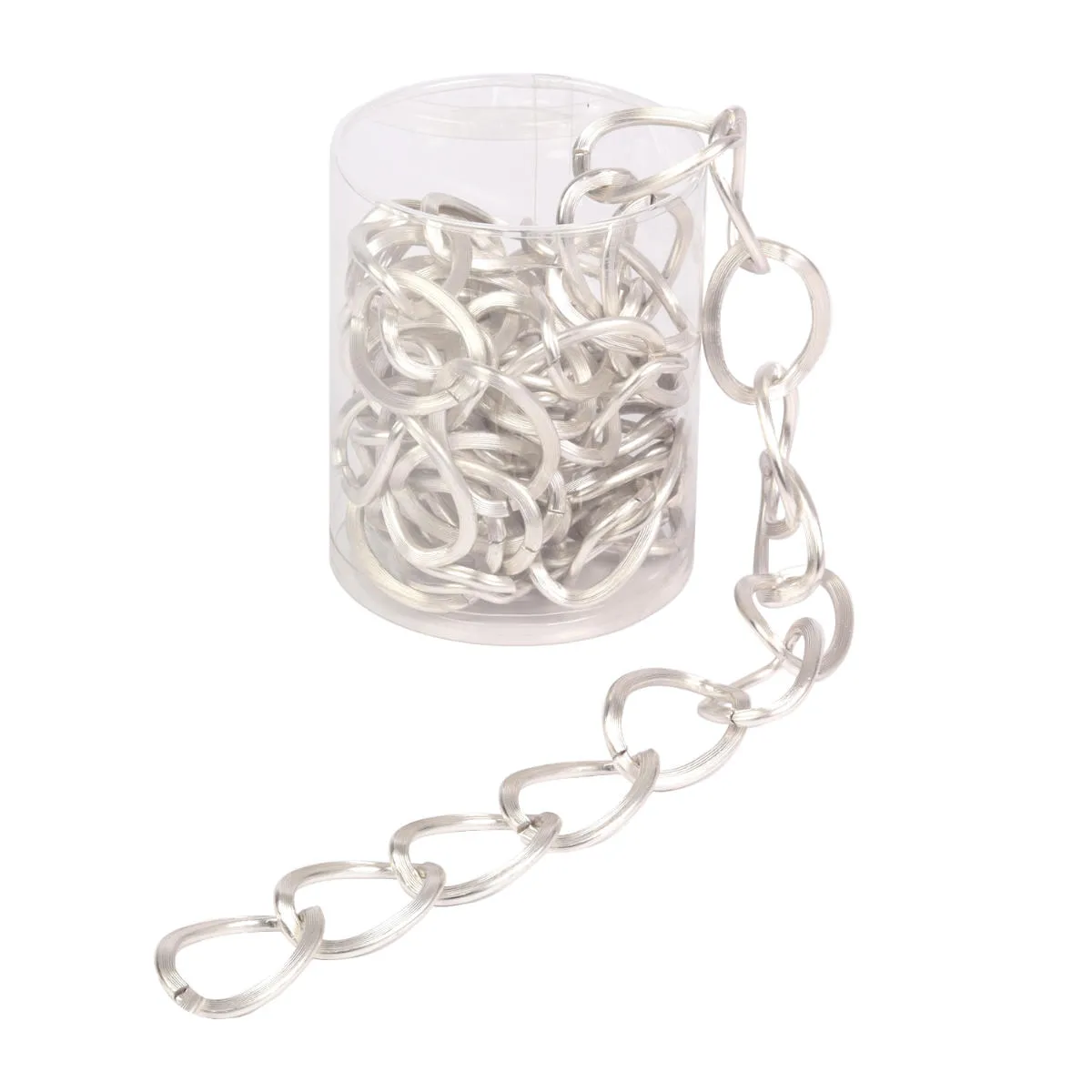 Dekoracyjny, srebrny łańcuch z matowym wykończeniem. Łańcuch o długości 270cm, wykonany w całości z aluminium. Posiada duże, płaskie ogniwa pokryte powłoką oksydowaną, co chroni produkt przed uszkodzeniami. Dodatkowo, ogniwa są rozłączane, dzięki temu można w łatwy sposób regulować długość łańcucha i dodawać do niego różnego rodzaju zawieszki. Łańcuch jest lekki i świetnie sprawdzi się przy tworzeniu dekoracji całorocznych oraz świątecznych.