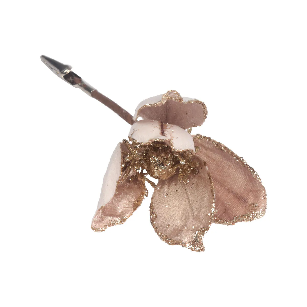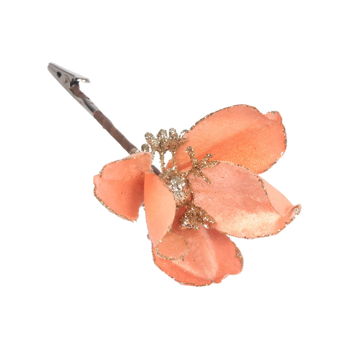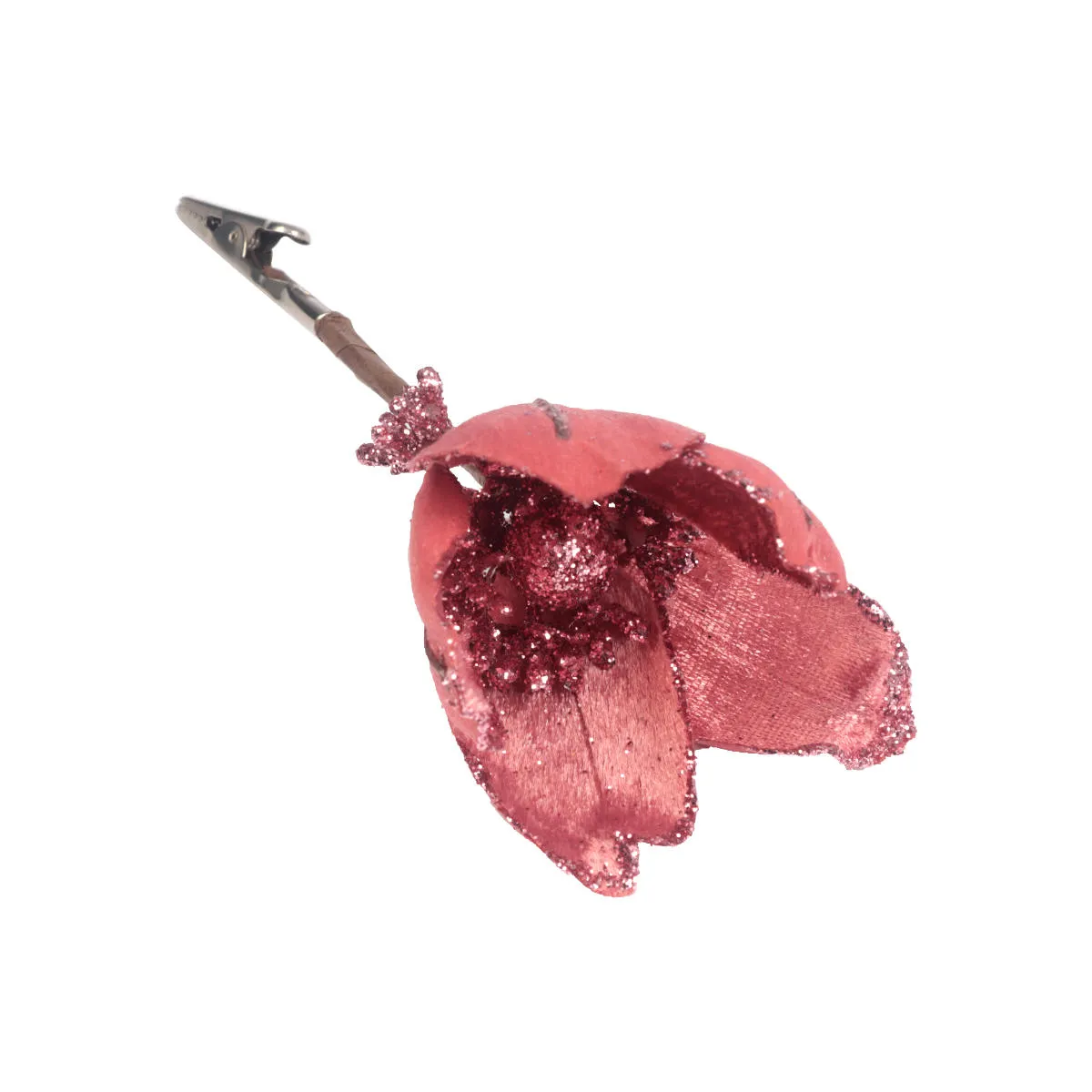 Dekoracyjna główka magnolii na metalowym klipsie. Bardzo starannie wykonana z materiału imitującego welur i ozdobiona dużą ilością brokatu główka o wielkości ok. 10cm. Idealnie nadaje się do zaczepienia na choince, girlandzie lub jako dodatek przy pakowaniu prezentów. Dostepna w trzech kolorach do wyboru : w kolorze szampańskim, łososiowym oraz w ciemnym odcieniu koloru różowego. Podana cena dotyczy 1 sztuki z wybranego koloru.