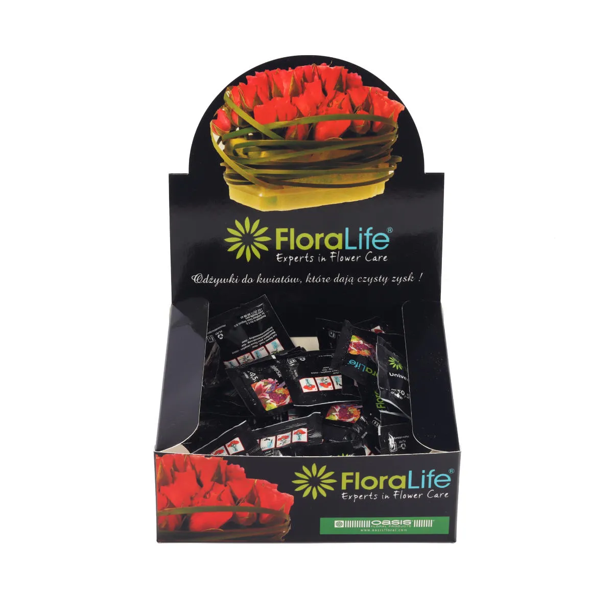 Oasis odżywki do kwiatów ciętych w bukietach. W opakowaniu znajduje się 100 saszetek z odżywką, która pozwoli dłużej cieszyć się bukietem w wazonie. Jedna saszetka wystarcza na 0,5 litra wody.