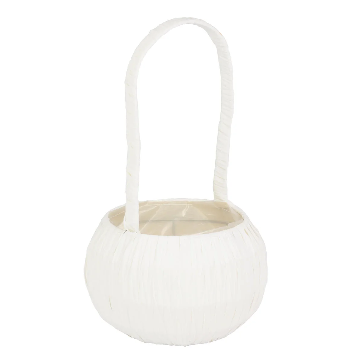 Okrągła osłonka na doniczki. Koszyk z pałąkiem na kwiaty lub zioła. Osłonka ozdobiona białymi paskami taśmy wykonanymi z tworzywa sztucznego. Środek wyłożony został bezbarwną folią a jego konstrukcja wzmocniona drucikiem. Osłonka idealnie nadaje się jako dekoracja parapetu, balkonu lub tarasu. Świetnie sprawdzi się również wykorzystana do wszelkich kompozycji florystycznych. Można wyłożyć ją odpowiednią florystyczną gąbką, aby umieścić w niej żywe lub sztuczne kwiaty.