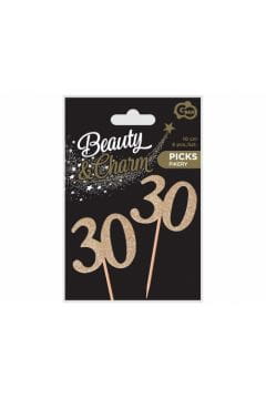 Pikery do babeczek, tortów 30-tki. Wykonane z papieru o brokatowej fakturze, przyozdobią każde ciasto, deser lub owoce. Znajdują się na drewnianych patyczkach, dzięki czemu stabilnie utrzymają się w cieście lub gęstym kremie. Atutem jest obszerność kolekcji która zawiera także girlandy urodzinowe, balony, dekoracje wiszace, słomki i ozdoby na tort.