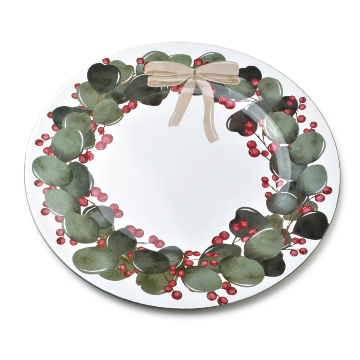 Talerz dekoracyjny w białym kolorze, z kolekcji Blanche Festive, z nadrukiem w postaci jarzębiny w liściach eukaliptusa z kokardą. W całości wykonany jest z tworzywa sztucznego i ma błyszczące wykończenie. Produkt nie jest przeznaczony do kontaktu z żywnością oraz do mycia w zmywarce.