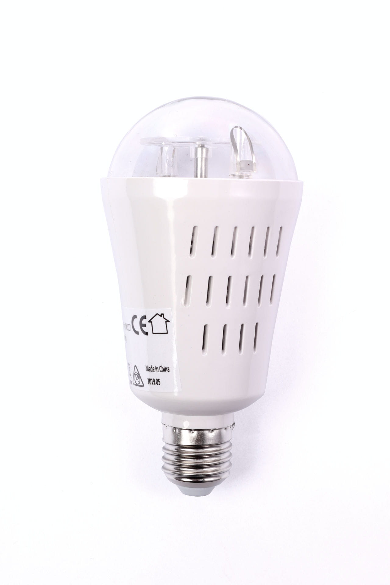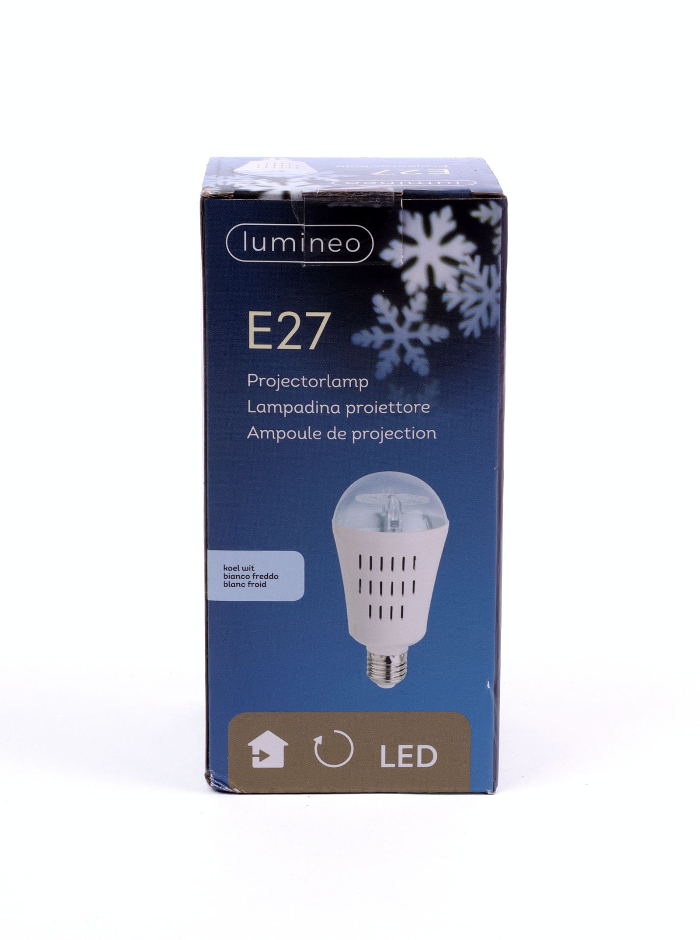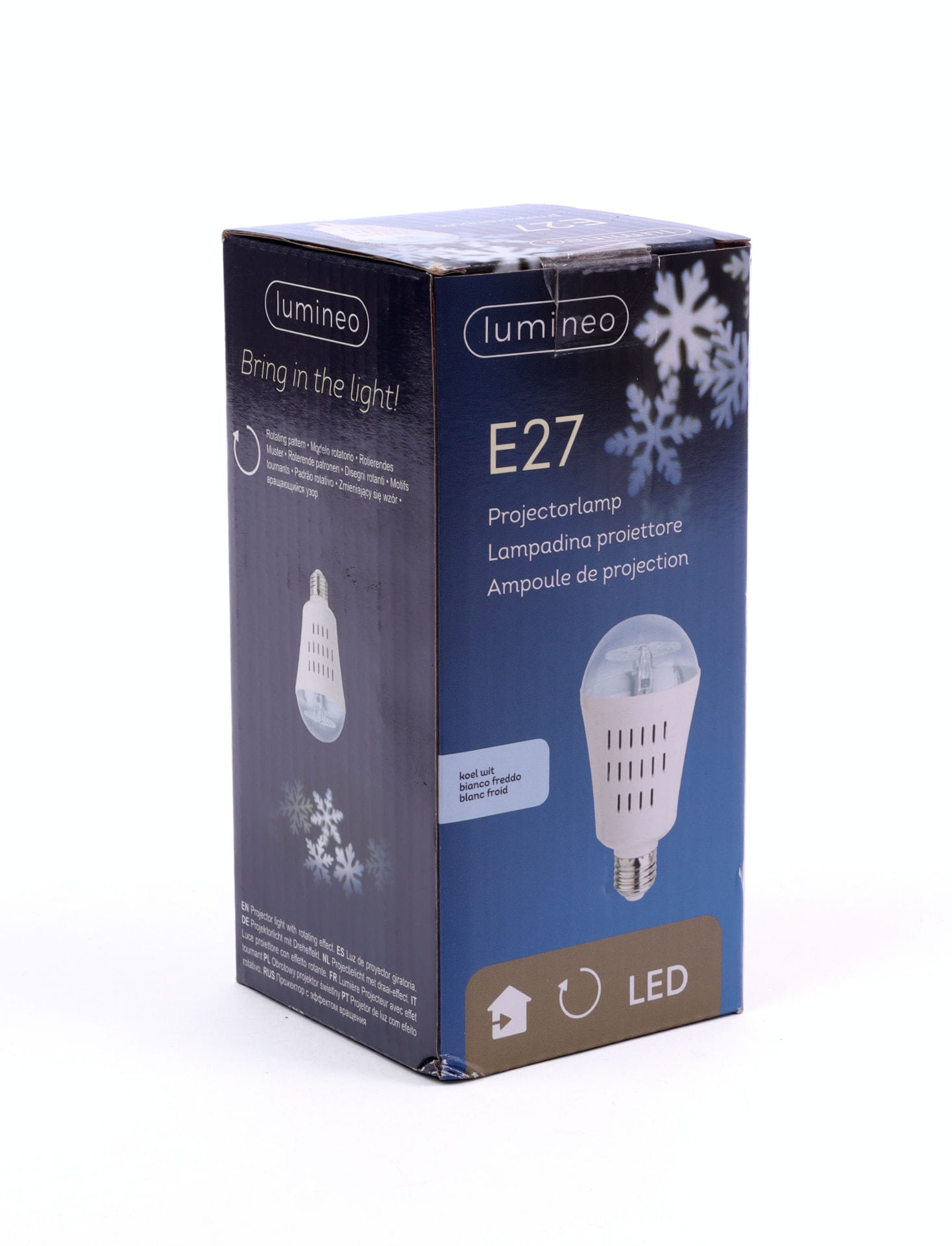 Reflektor LED - śnieżynki o zimnym odcieniu bieli. Po uruchomieniu na płaskiej powierzchni widoczny jest wybrany wzór. Obraca się on cyklicznie, kształty maja różną wielkość. Zasięg wyświetlania wynosi 8 metrów a obraz pokrywa powierzchnię 36m2. Produkt można dowolnie stosować, gdyż ma kształt tradycyjnej żarówki o popularnym gwincie E27.