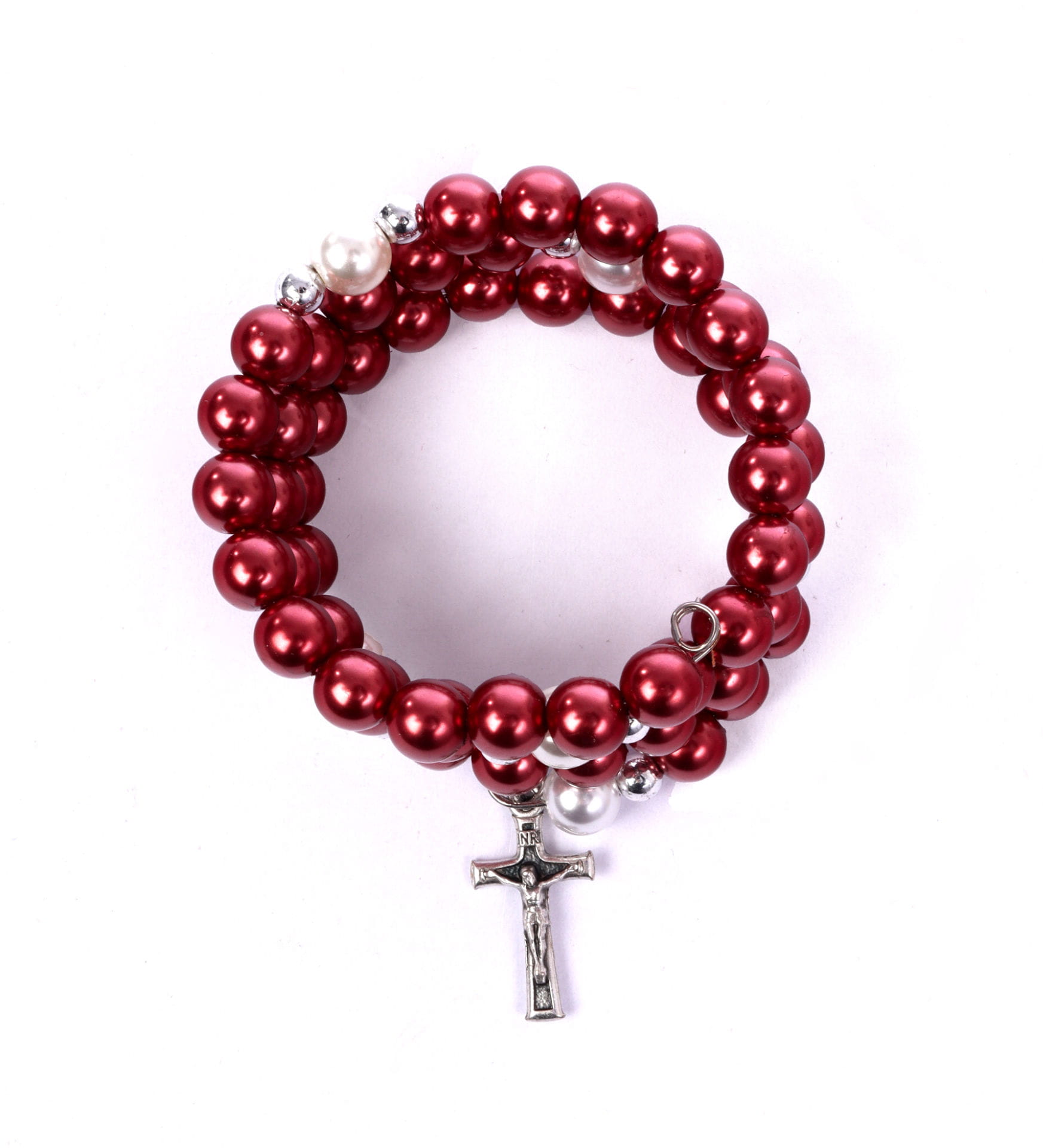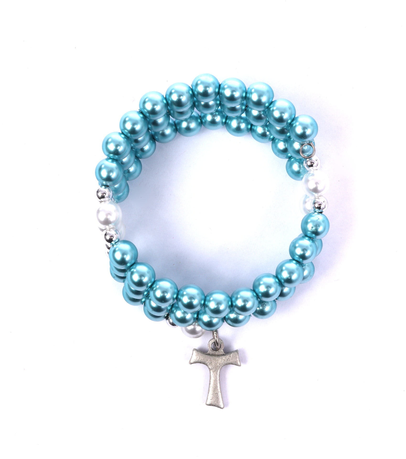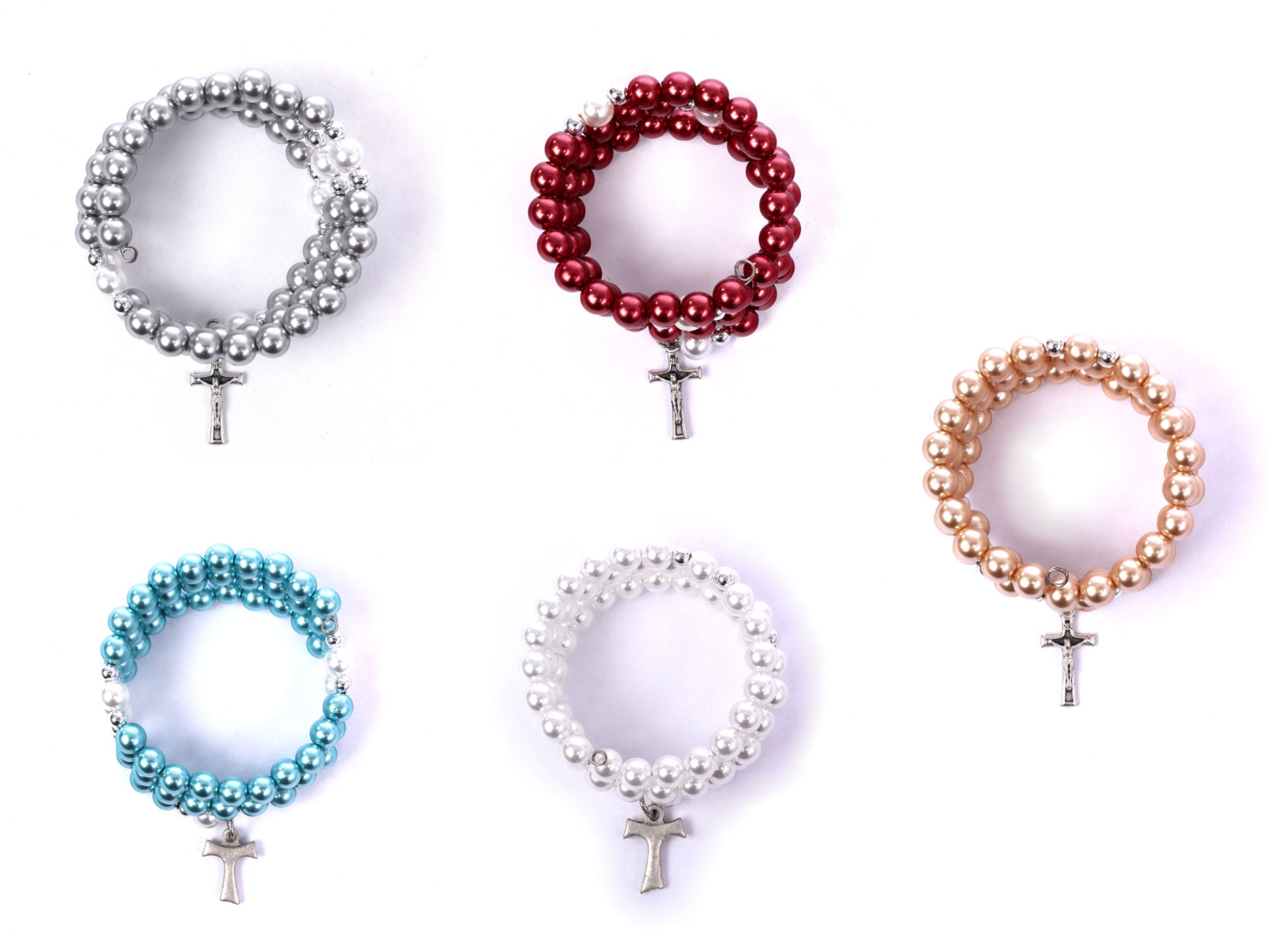 Bransoletka, różaniec na sprężynie wykonany z perłopodobnych koralików, w rozmiarze uniwersalnym, dostosowuje się do nadgarstka.