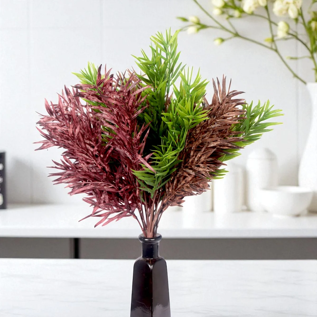 Sztuczny, dekoracyjny Ruskus w formie bukietu o wysokości 47cm, dostępny w trzech kolorach do wyboru. Wykonany jest w całości z tworzywa sztucznego i posiada 6 gałązek, które łącza się w jedną łodygę zakończoną plastikiem. Umożliwia to wbijanie łodygi w podłoże. Bukiet sprawdzi się jako samodzielna dekoracja w wazonie. Doskonale nadaje się też jako element kompozycji. Gałązki można oddzielić od łodygi i wykorzystać przy tworzeniu wianków lub stroików.