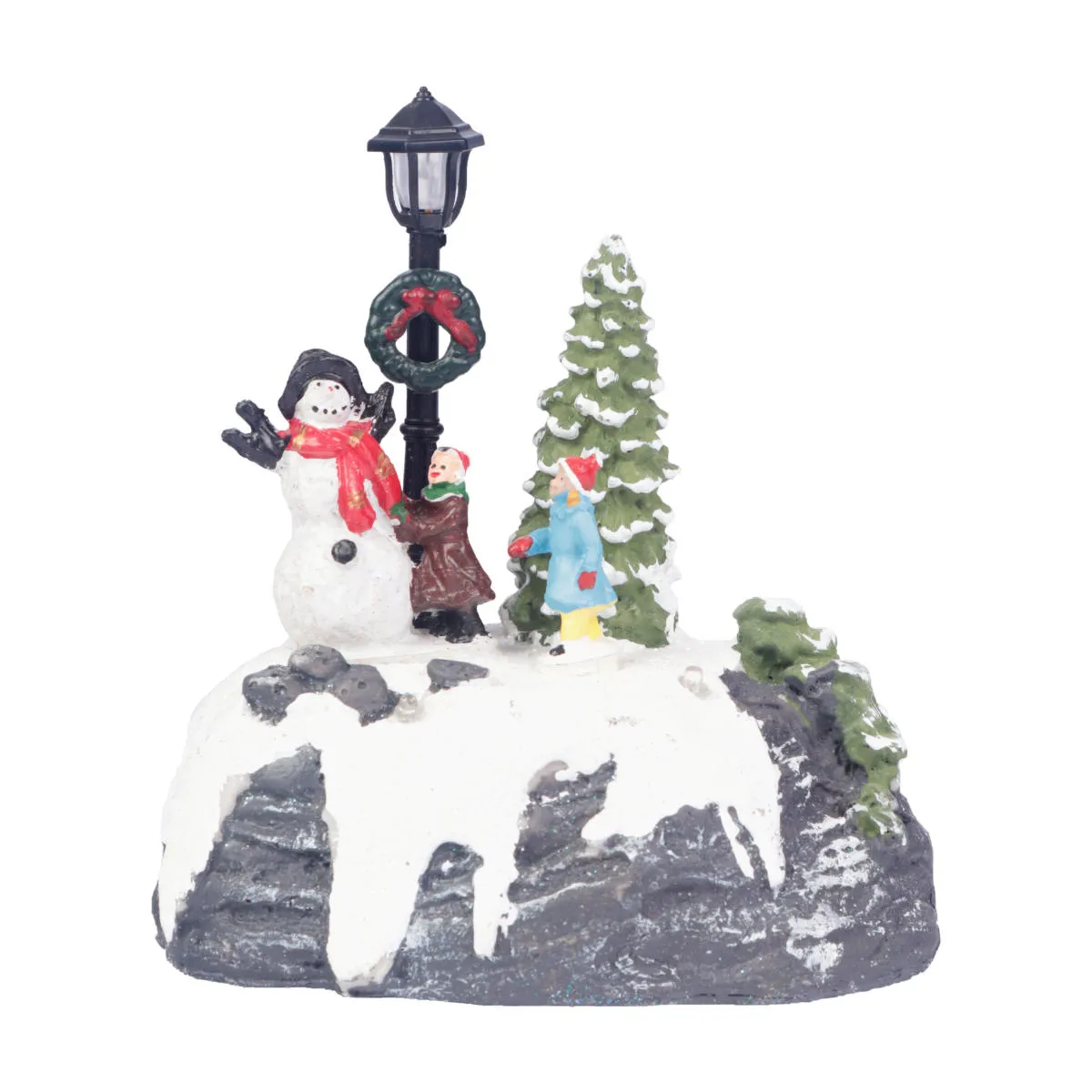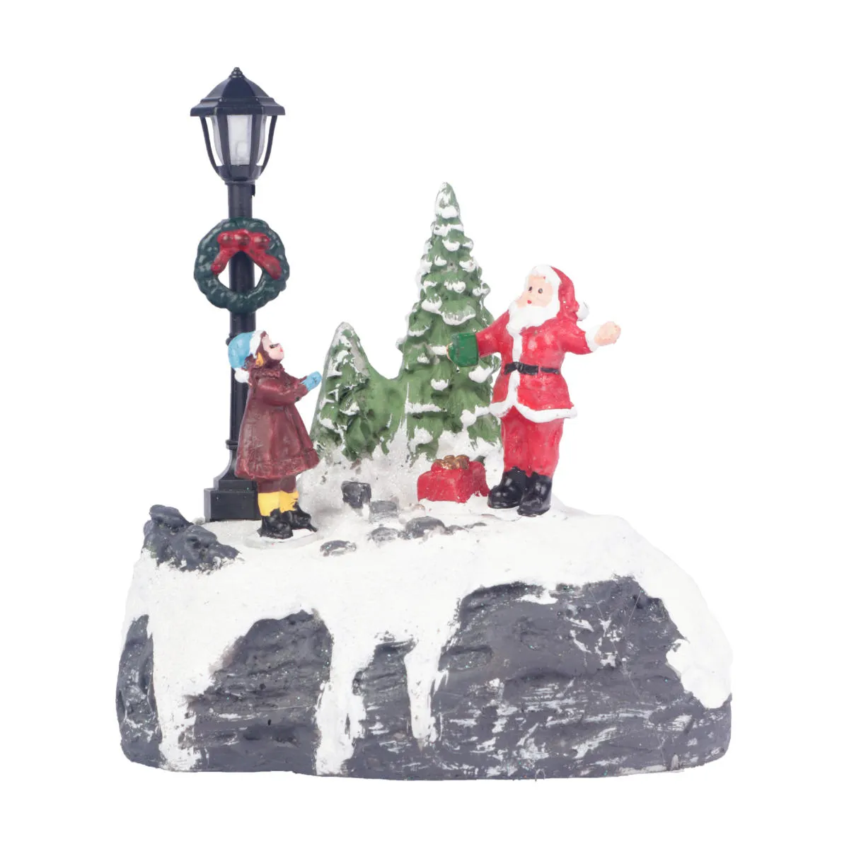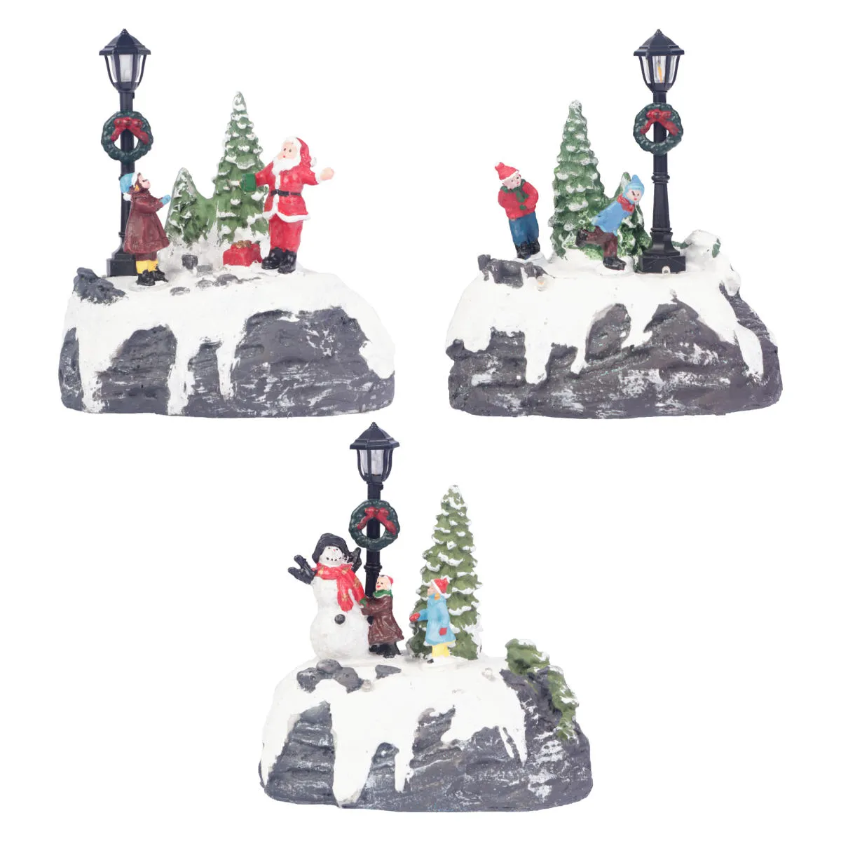 Dekoracja świąteczna, scenka zimowa z latarnią z diodą LED. Dekoracja wykonana jest z żywicy syntetycznej a następnie pomalowana ręcznie specjalistycznymi farbami. Idealnie nadaje się jako ozdoba parapetu okna, kominka lub komody. Dioda umieszczona w latarni świeci ciepłym, białym światłem. Całość zasilana jest dwiema bateriami AAA (brak w zestawie). Produkt dostępny w trzech wzorach do wyboru. Podana cena dotyczy jednej sztuki z wybranego wzoru.