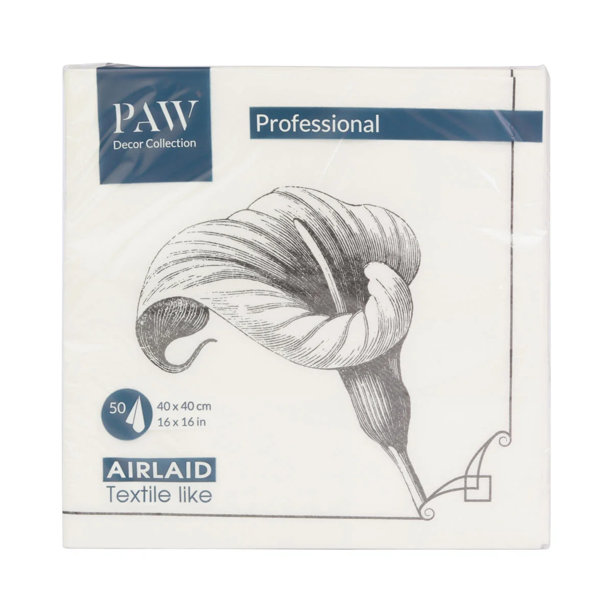 Flizelinowe serwetki Memory Flower firmy PAW, białe z czarnym kwiatem Anturium. Wysokiej jakości flizelina świetnie imituje naturalny materiał. Serwetki są grube i sztywne, można je układać na płasko lub składać w dowolne formy przestrzenne. Serwetki są w pełni ekologiczne.