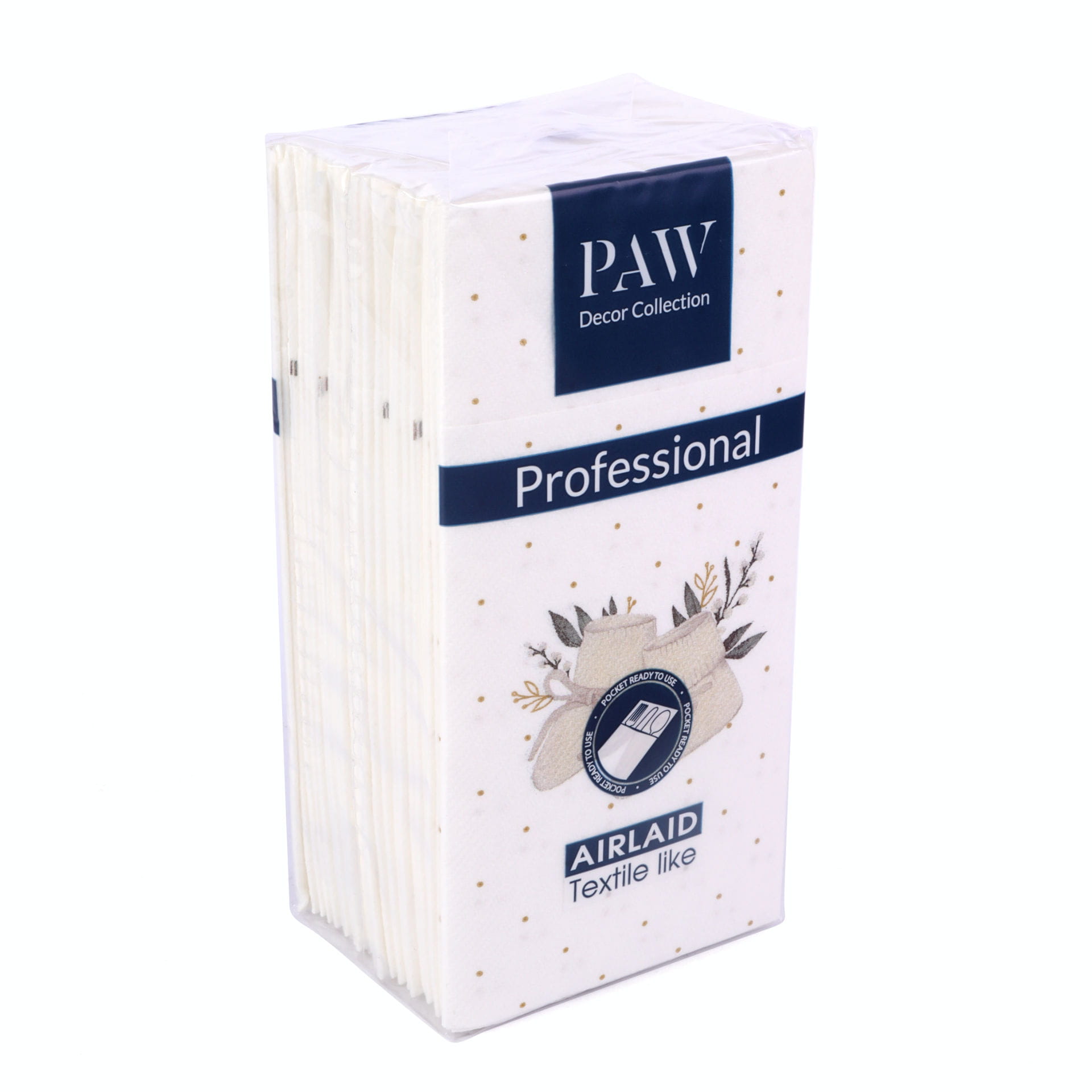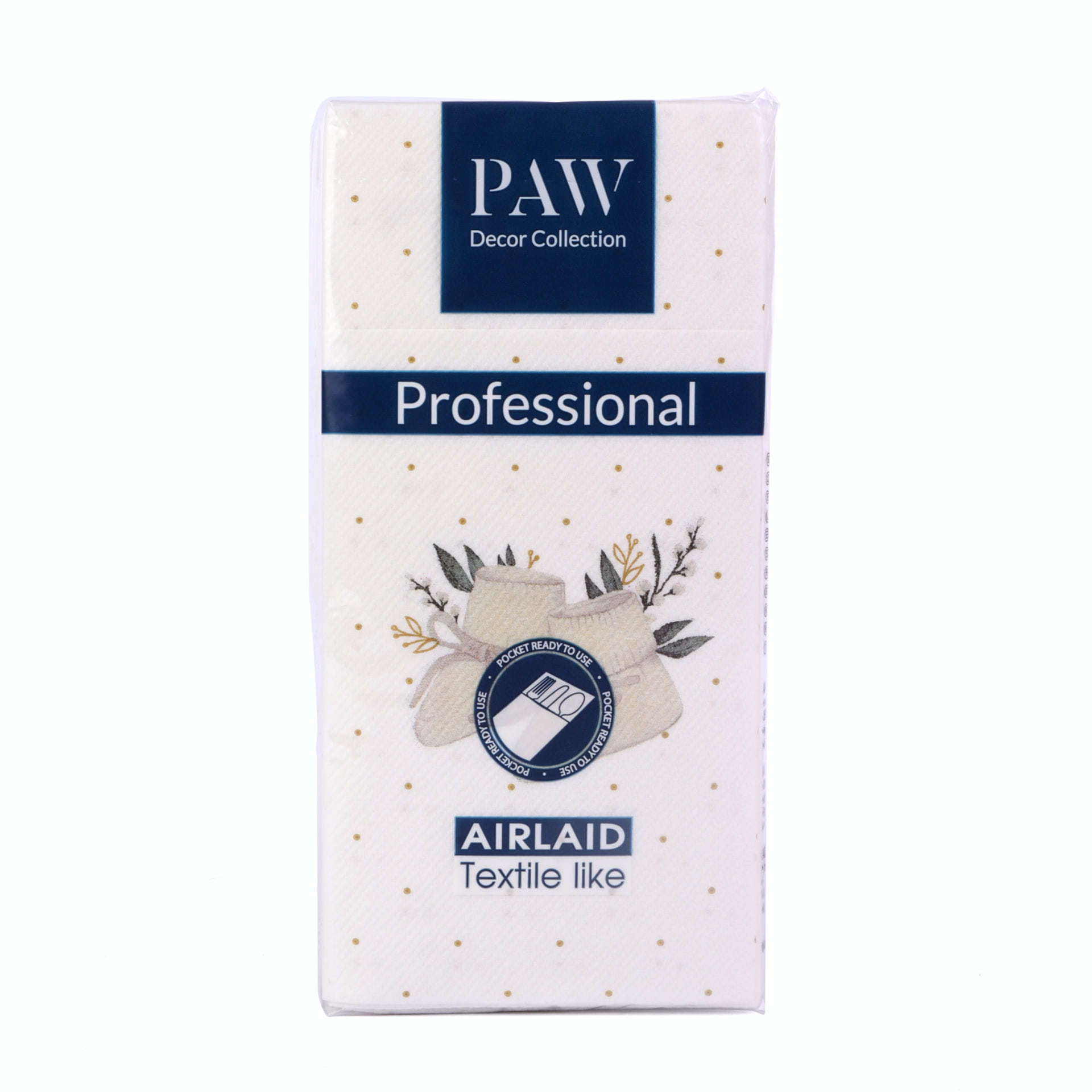 Flizelinowe kieszonki na sztućce Hello Baby firmy Paw, z serii PAW Professional. Ozdobione motywem bucików i gałązek eukaliptusa. Serwetki utrzymane są w uniwersalnej kolorystyce, dzięki czemu sprawdzą się na uroczystości chłopca jak i dziewczynki. Wykonane z flizeliny doskonale imitującej naturalny materiał kieszonki są złożone i gotowe do użycia.