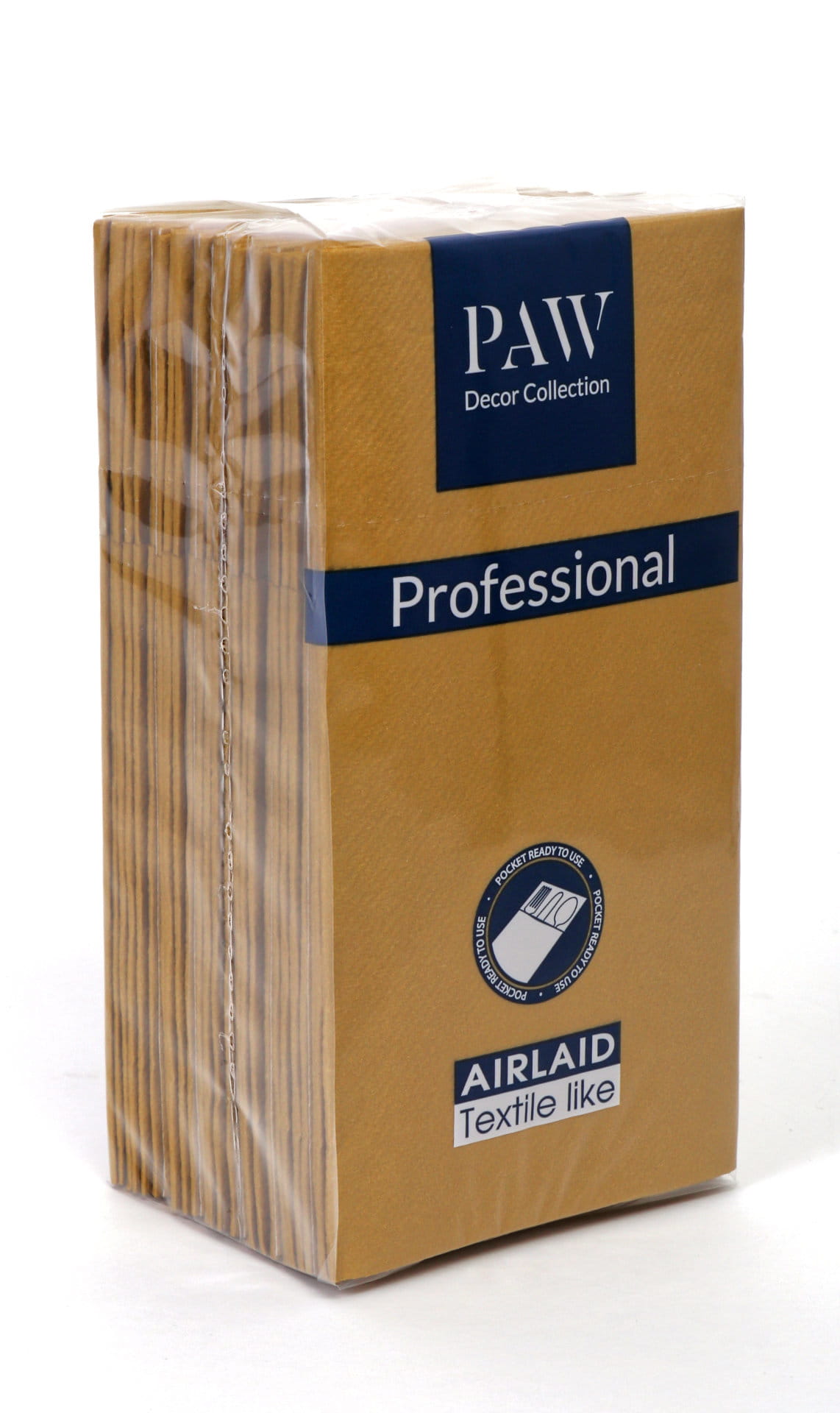 Złote, flizelinowe kieszonki na sztućce. Kieszonki z serii Paw Professional, są złożone i gotowe do użycia. Wykonane z flizeliny doskonale imitującej naturalny materiał. Rozmiar po rozłożeniu : 40x40cm. Ilość sztuk w opakowaniu : 25 sztuk