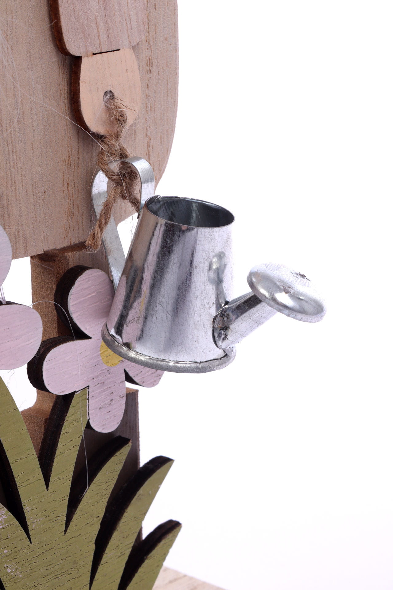 Dekoracyjna figurka wiosenna przedstawiająca skrzata ogrodnika z konewką. Całość znajduje się na stabilnej podstawce. Dekoracja wykonana została z drewna oraz pomalowana w przyjemnych wiosennych barwach. Ciekawym akcentem jest metalowa konewka oraz wzorzysta czapka skrzata.