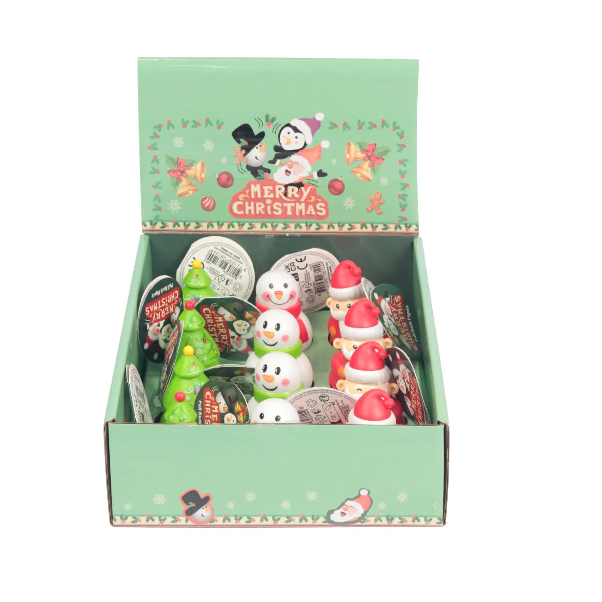 Komplet ruchomych, świątecznych figurek o wysokości 6cm. Wykonane z wysokiej jakości tworzywa sztucznego zabawki. Doskonale sprawdzą się na upominek z okazji Świąt Bożego narodzenia lub prezent na Mikołajki. Figurka z napędem, po pociągnięciu do tyłu i puszczeniu, natychmiast ruszy do przodu na dwóch małych kółeczkach. Uruchomienie napędu jest niezwykle proste i nie wymaga użycia siły. Zabawka będzie doskonałym upominkiem dla najmłodszych. W zestawie znajdują się figurki przedstawiające Mikołaja, bałwanka i choinkę.