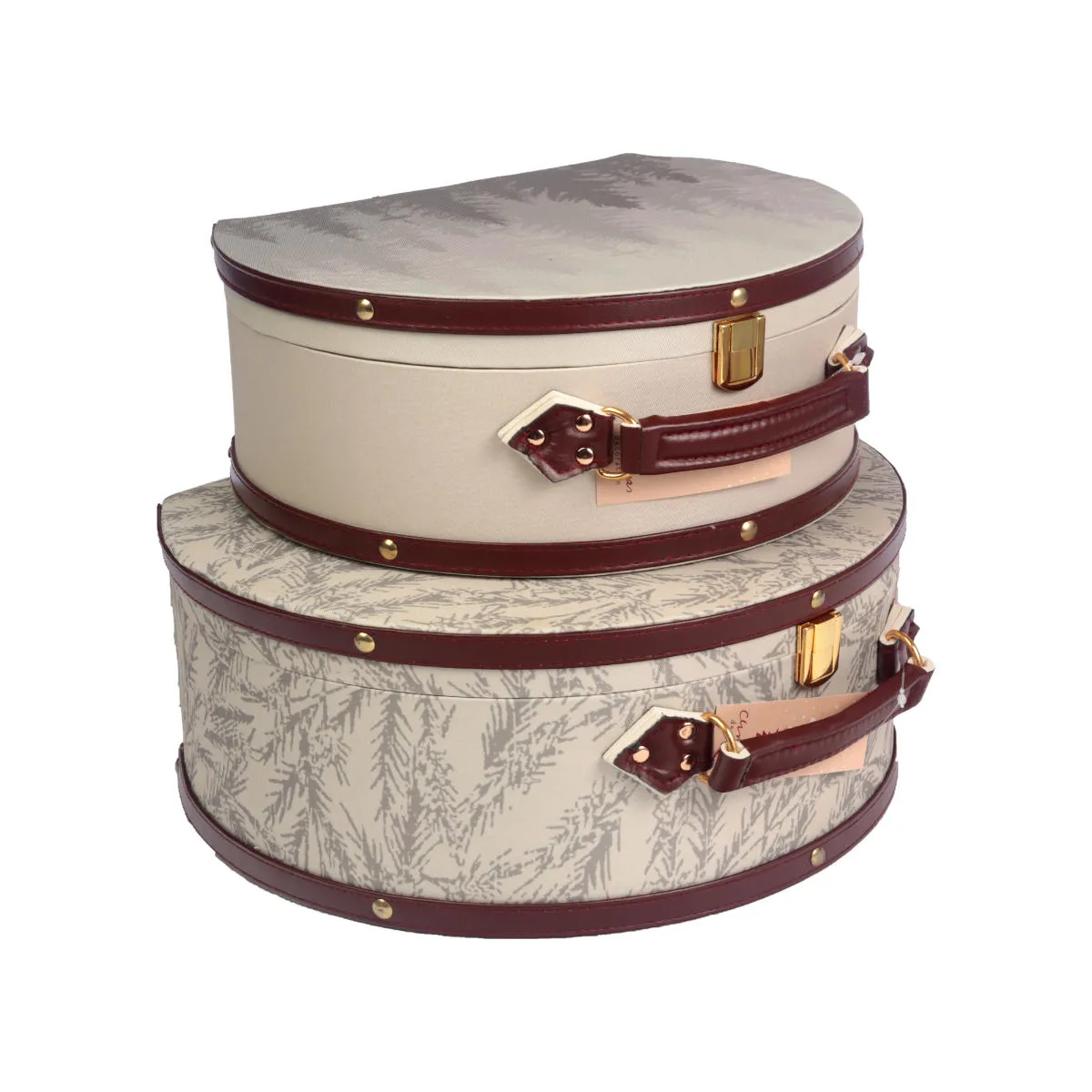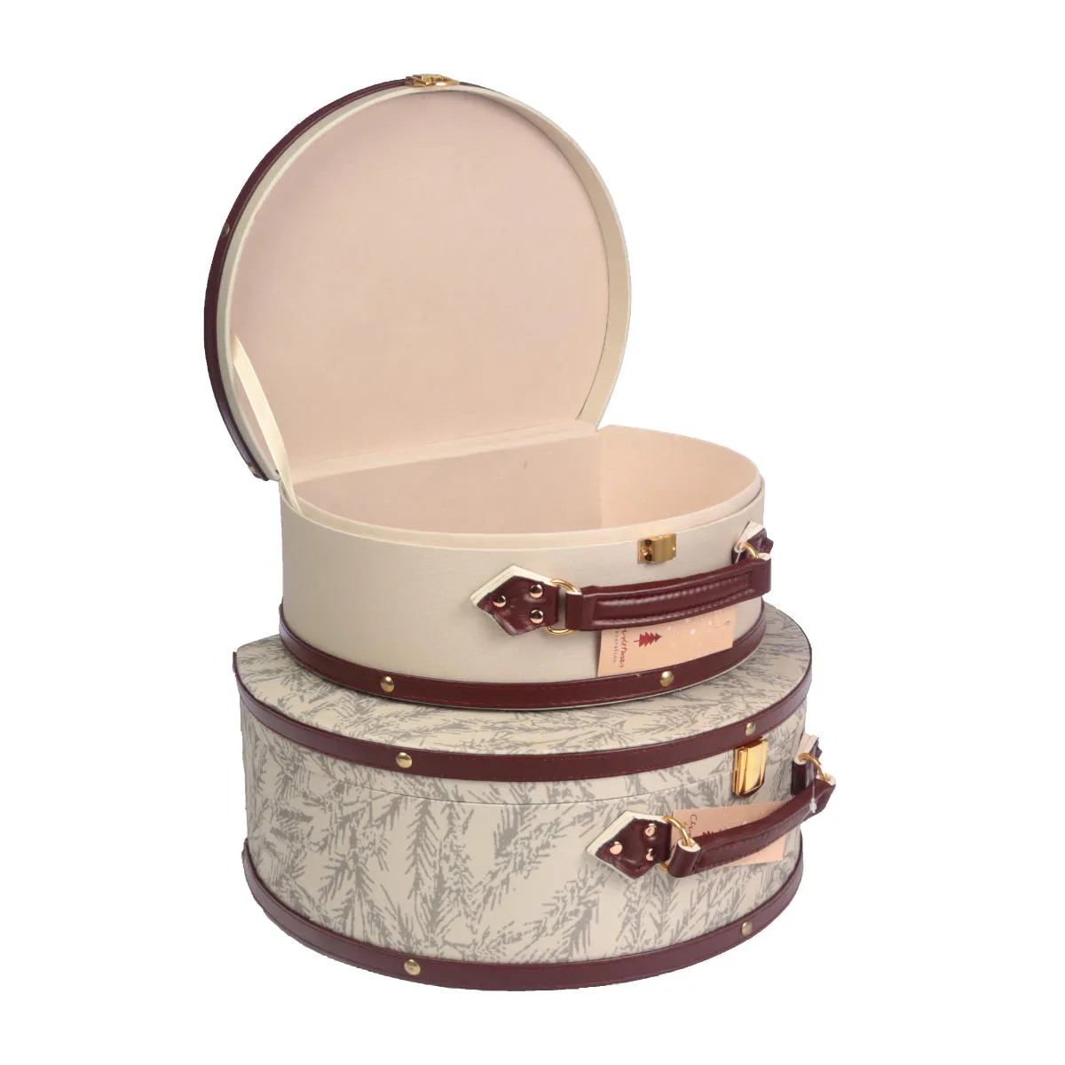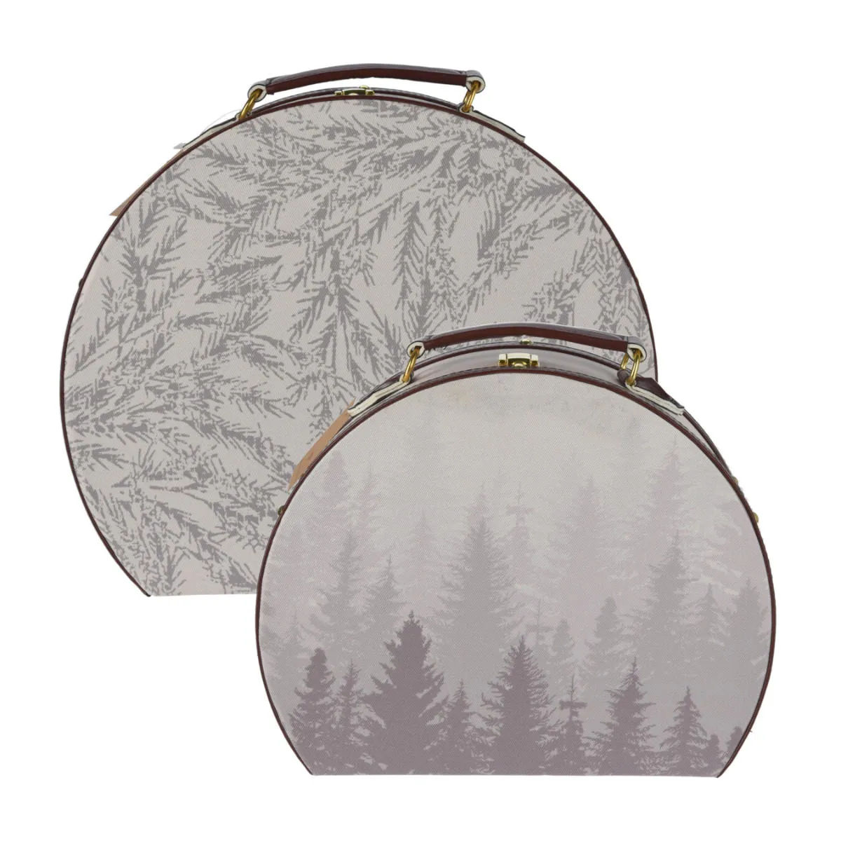 Komplet dwóch świątecznych kuferków w kolorze beżowym. Dekoracyjne, prezentowe walizki, wykonane są bardzo starannie z grubego kartonu i pokryte tkaniną z szarym motywem drzew i gałązek. Każde pudełko wykończone jest brązową lamówką i posiada uchwyt z materiału imitującego skórę. Kuferki posiadają również wygodne otwieranie na zatrzask. Pudełka świetnie nadają się jako dekoracja, opakowanie na prezent oraz jako szkatułki na biżuterię lub inne drobiazgi. Podana cena dotyczy kompletu 2 sztuk.