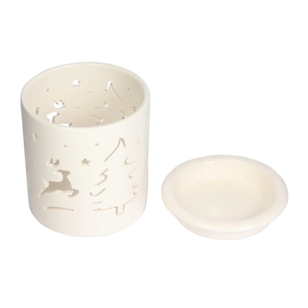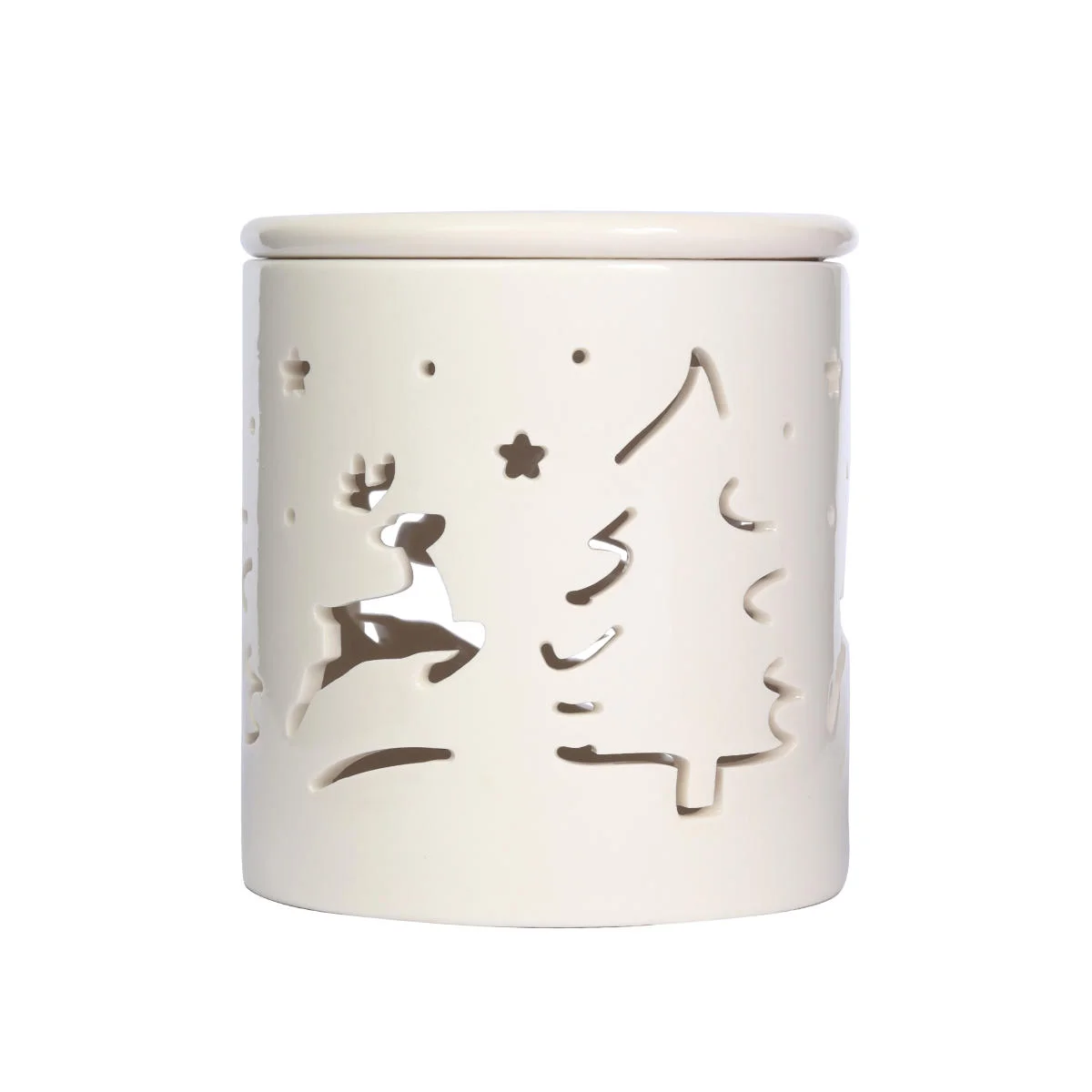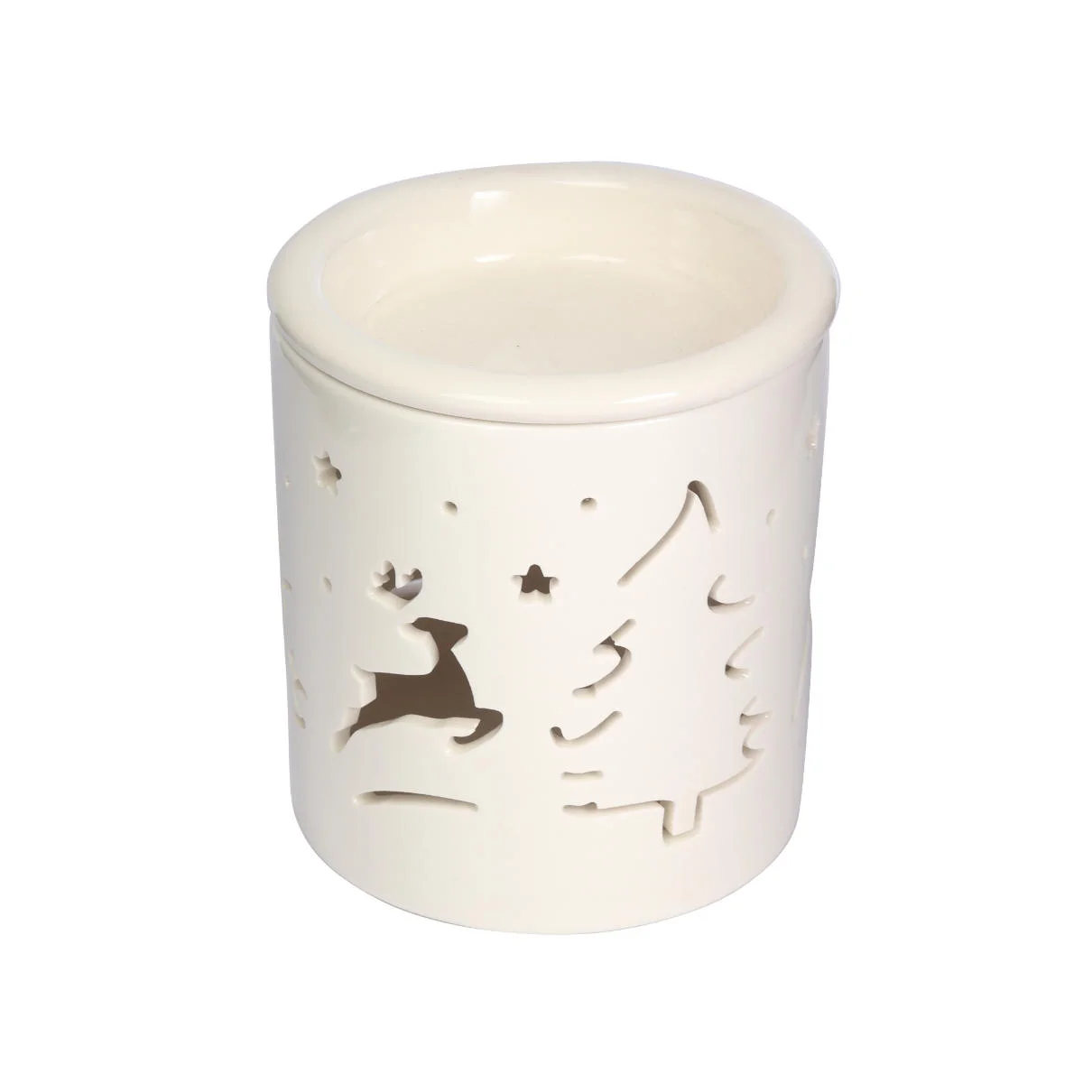 Świąteczny, ceramiczny kominek z ażurowym wzorem w postaci renifera i choinki. Przeznaczony do rozprowadzania w powietrzu zapachów z olejków eterycznych i wosków zapachowych. Kominek w białym kolorze z dużą miseczką na olejek. Zapakowany w estetyczny, biały kartonik.