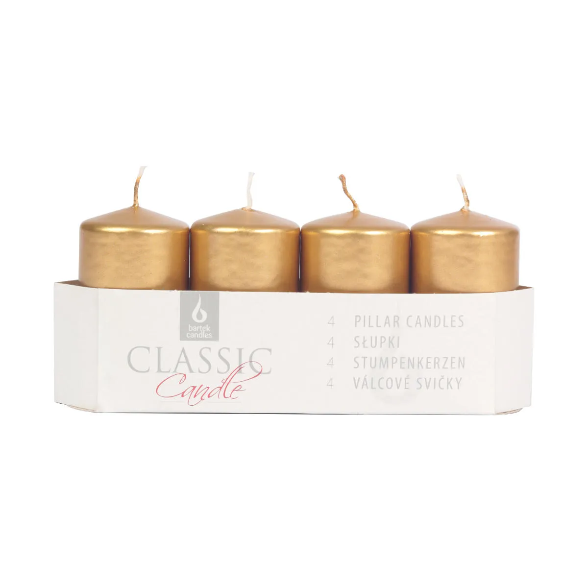 Gładkie, dekoracyjne świeczki w kształcie walca, w kolorze złotym z metalicznym wykończeniem. Parafinowe świece słupki o czasie palenia do 10h. Idealnie nadają się do stroików i świeczników, podczas dowolnych uroczystości. Produkty marki Bartek wypalają się równomiernie, nie kapią i nie kopcą. Podana cena dotyczy kompletu 4 sztuk.