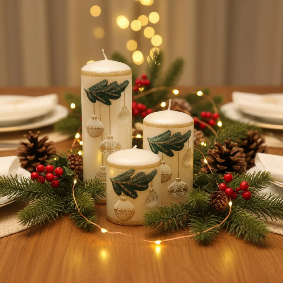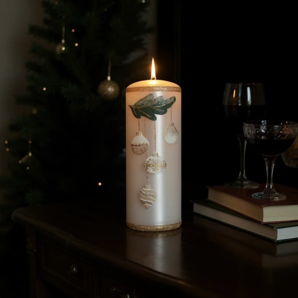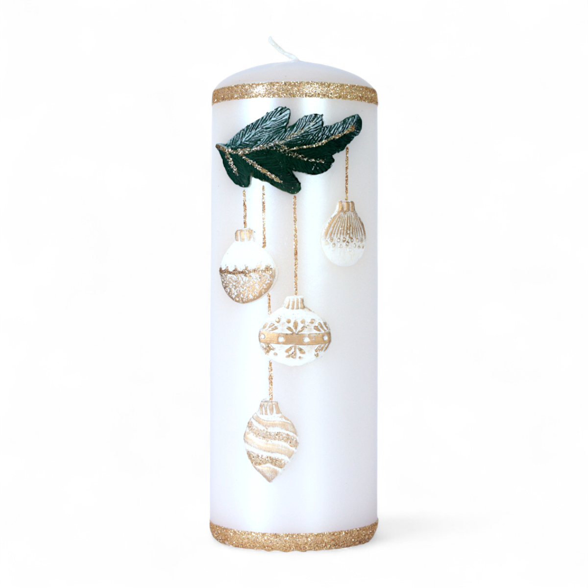 Wykonana z białej parafiny i ozdobiona tłoczonym wzorem przedstawiającym bombki na gałązce, delikatnie obsypana złotym brokatem. Świeca jest bezwonna, idealnie sprawdzi się jako dekoracja do świecznika, element stroika, jako upominek lub dodatek do prezentu.
