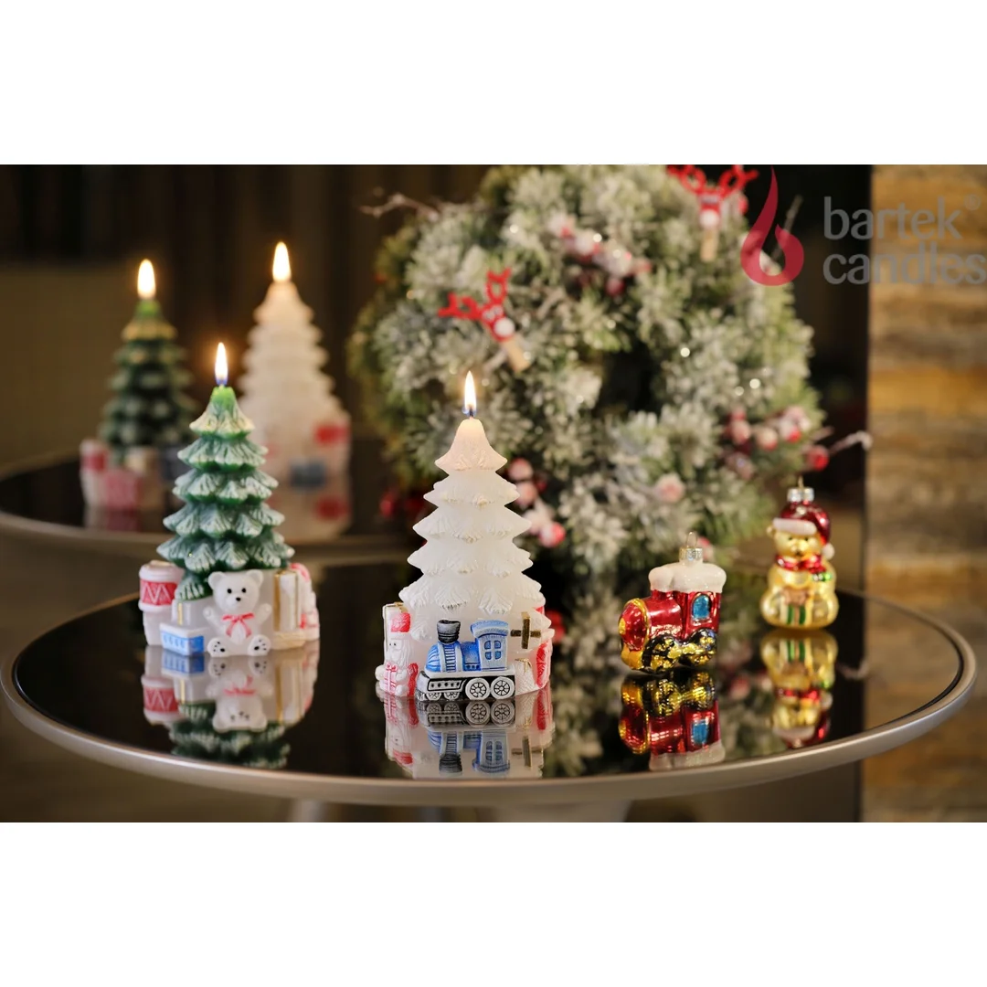 Świąteczna świeczka dekoracyjna. Parafinowa świeca, zielona choinka z prezentami, delikatnie obsypana brokatem. Świeczka o wysokości 15cm i czasie palenia do ok. 40 godzin. Idealnie nadaje się na dekoracje stołu, komody lub parapetu okna. Sprawdzi się również jako upominek lub dodatek do prezentu.
