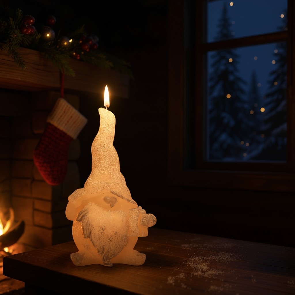 Dekoracyjna świeczka bożonarodzeniowa. Figurka w kształcie biało-srebrnego skrzata o wysokości 14cm, ozdobiona brokatem. Parafinowa świeca, idealnie nadaje się na element dekoracyjny wianka lub stroika. Świetnie sprawdzi się również jako upominek lub dodatek do prezentu.